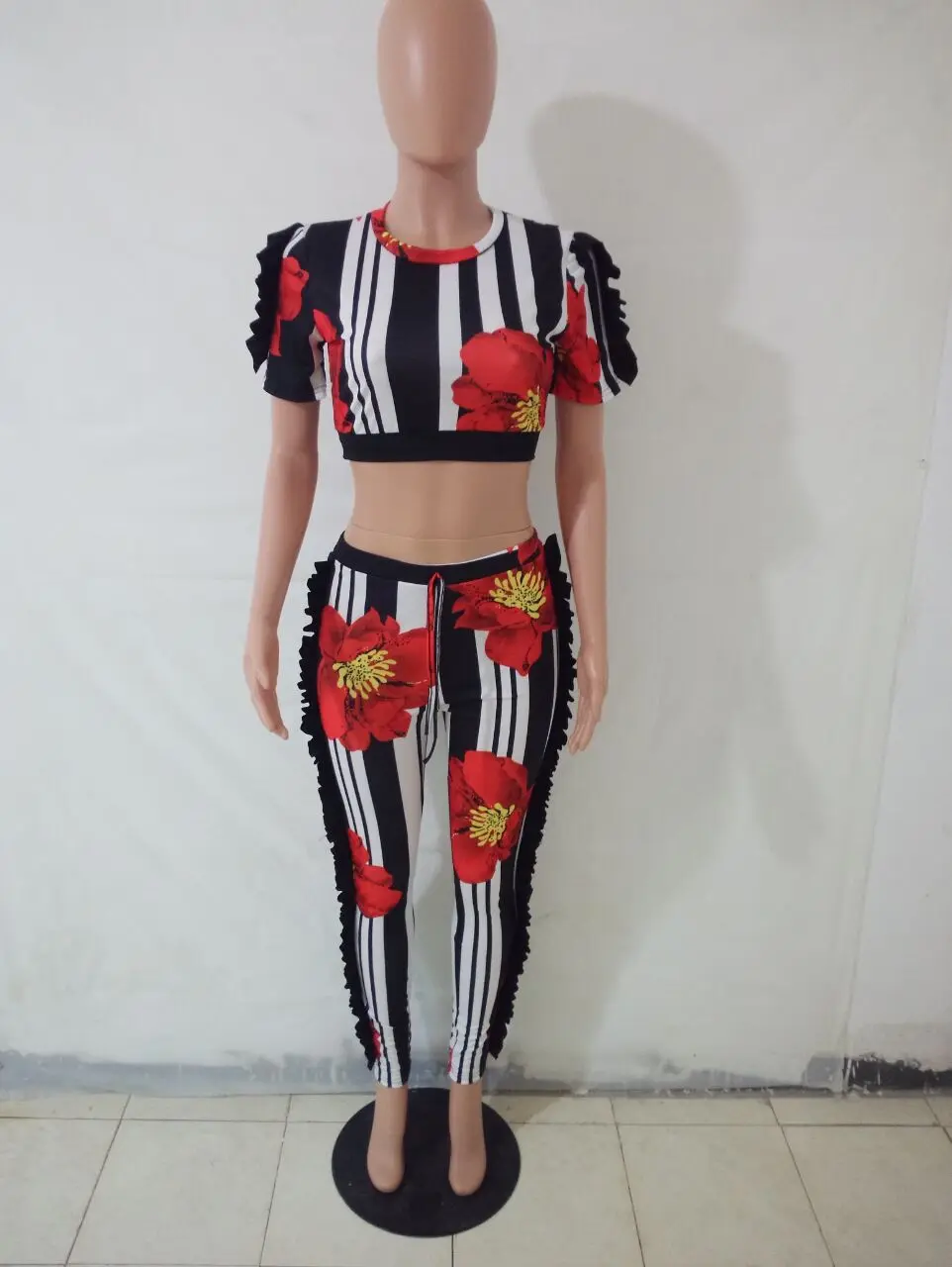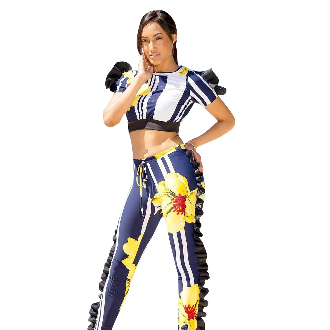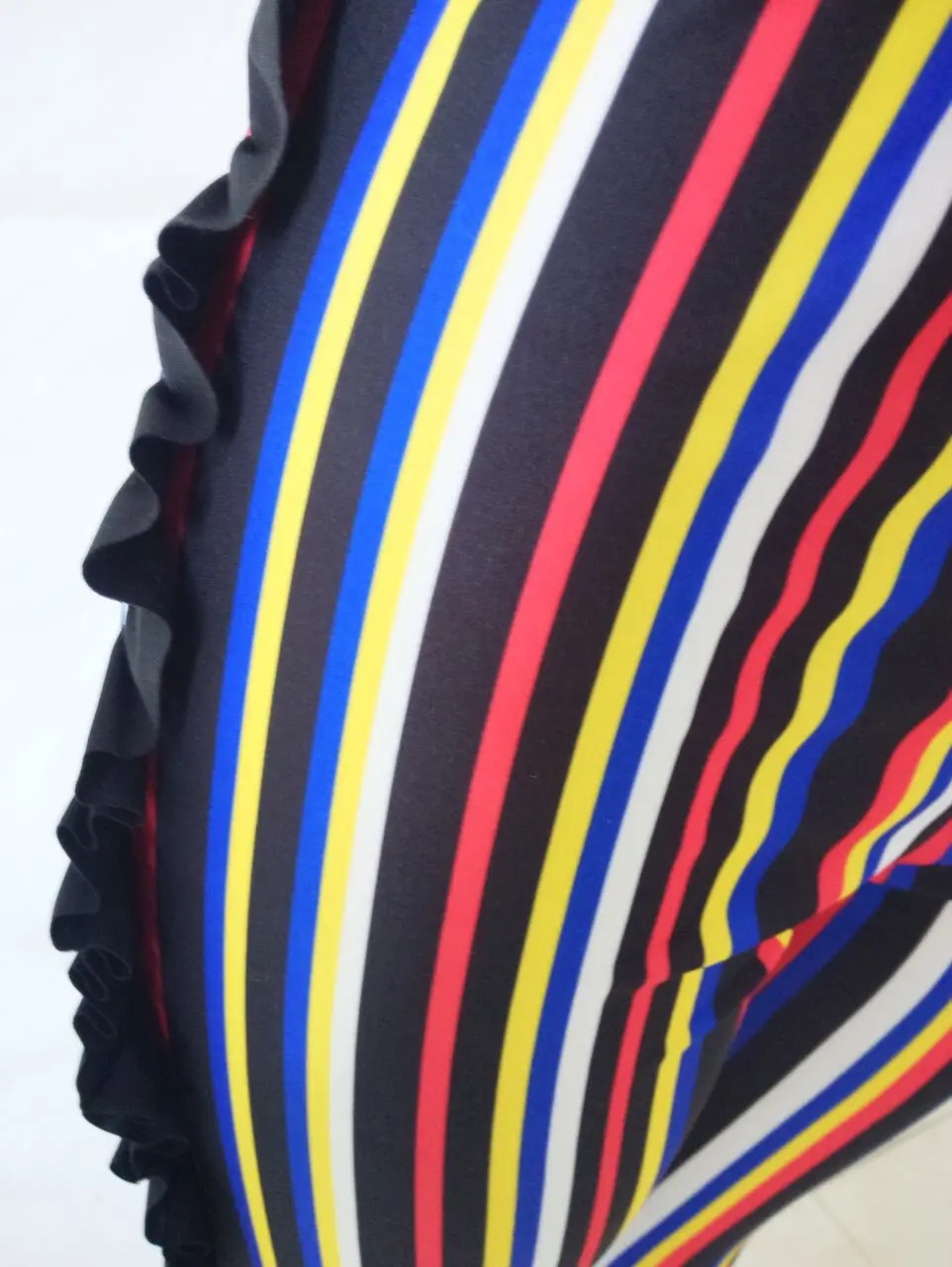 Распродажа, комплект из двух предметов в разноцветную полоску с оборками, радужный укороченный топ с короткими рукавами, брюки-карандаш, спортивный костюм, костюмы для отдыха