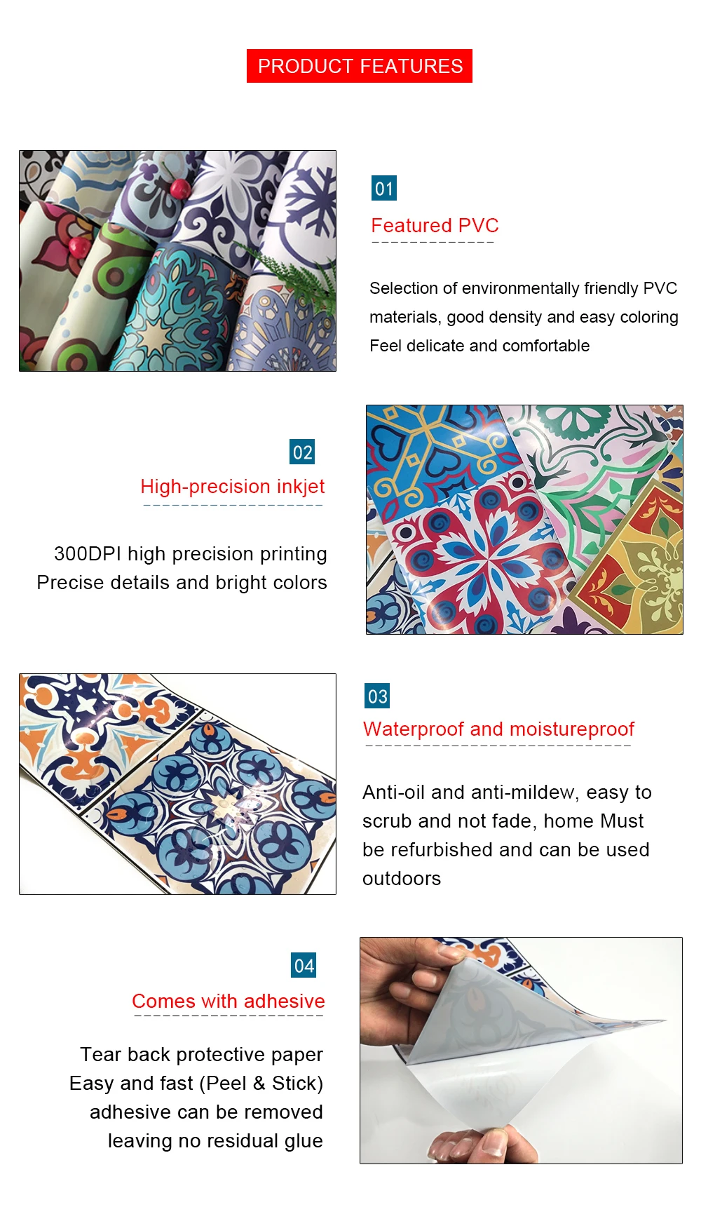 Вес изделия: 30 г 45 г 60 г Упаковка продукта: Opp мешок Продукт Размеры: 10*50 см * 1 шт. 15*75 см * 1 шт. 20*100 см * 1 шт. Цвет продукта: коричневый Материал изделия: винил высокого качества с защитой окружающей среды Продукт Функция: 1. Самоклеящаяся бумага очень удобно отклеивать заднюю защитную бумагу и наклеивать ее непосредственно на стену. 2. Съемный. После разрыва не оставит клея и не повредит поверхность стены. 3. Полностью липкий. Подходит для любой гладкой, плоской стены, плитки, стекла и т. д. (не подходит для поверхности с серым слоем) 4. Водонепроницаемый. Материал экологически чистый водонепроницаемый ПВХ материал. Он водонепроницаемый, прочный и не легко рвется. 5. На поверхности есть слой водонепроницаемой и глянцевая защитная пленка. Может предотвратить золу и водонепроницаемость. 6. Яркий и полный цвет, можно использовать на открытом воздухе без выцветания 7. Набор имеет 5 различных моделей. Каждый рисунок-квадратный. Его можно разрезать ножницами или кухонным ножом. Очень удобно 8. Сфера применения. Подходит для крепления на кухню, ванную комнату, гостиную, детскую комнату и т. д. также может использоваться как наклейка на уровне талии.