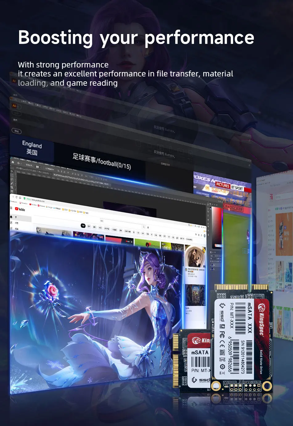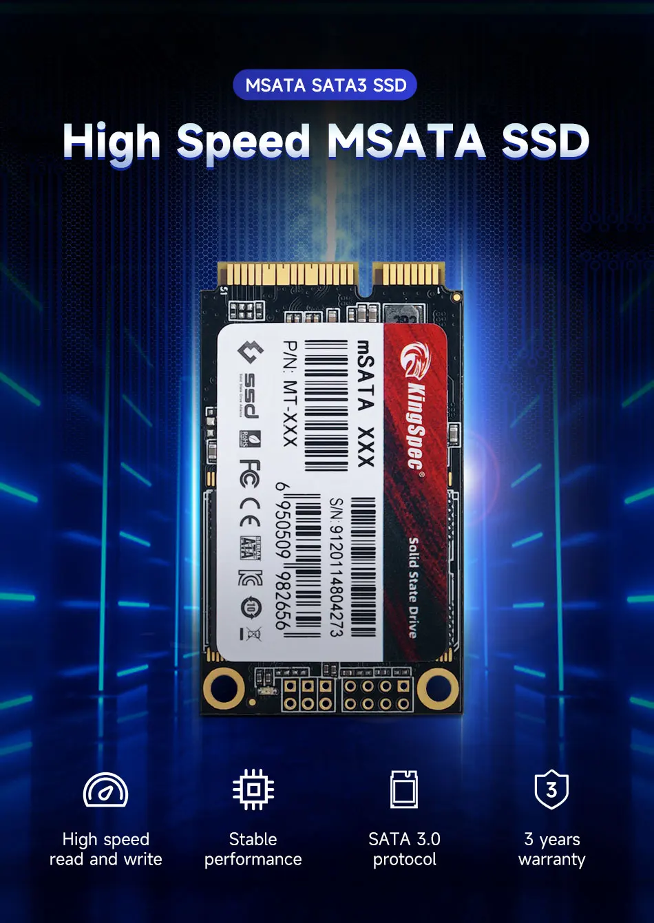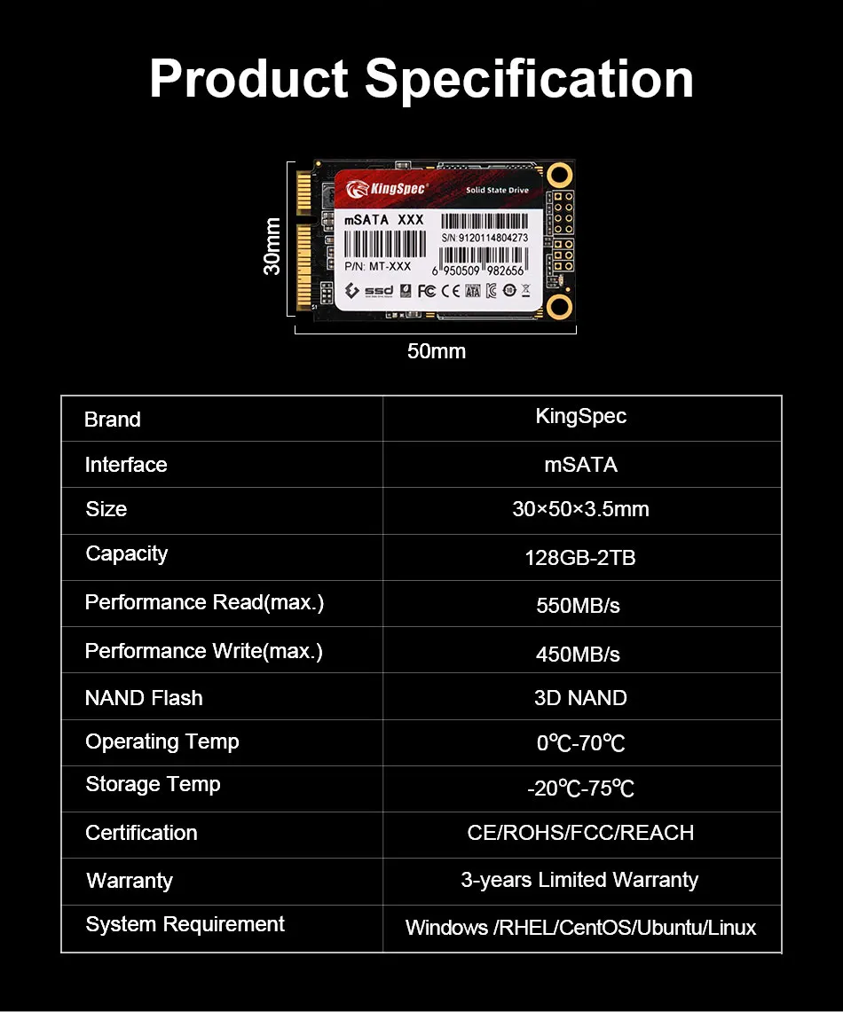 Brand : KingSpecInterface :mSATASize :30*50*3.5mmCapacity : 128GB-2TBPerformance Read Max :550MB/sPerformance Write Max :450MB/sNAND Flash :3D NANDCertification :OE/ROHS/FGG/REACHWarrany :3-years