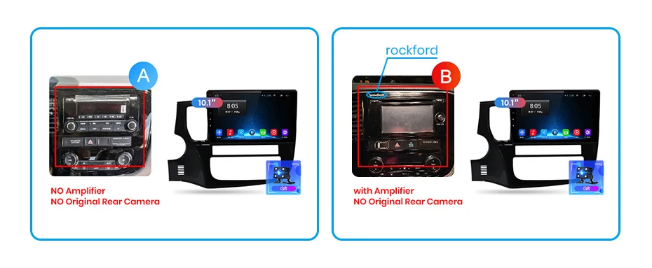 Если ваше оригинальное радио имеет "rockford", как показано ниже, и не имеет оригинальной задней камеры, пожалуйста, выберите "B" версию, которая поставляется с canbus; Если нет "rockford", нет тыловой камеры, пожалуйста, выберите "A" версию; Если ваше оригинальное радио имеет "rockford", как показано ниже, и имеет оригинальную заднюю камеру, пожалуйста, свяжитесь с нами, чтобы купить другой кабель питания;