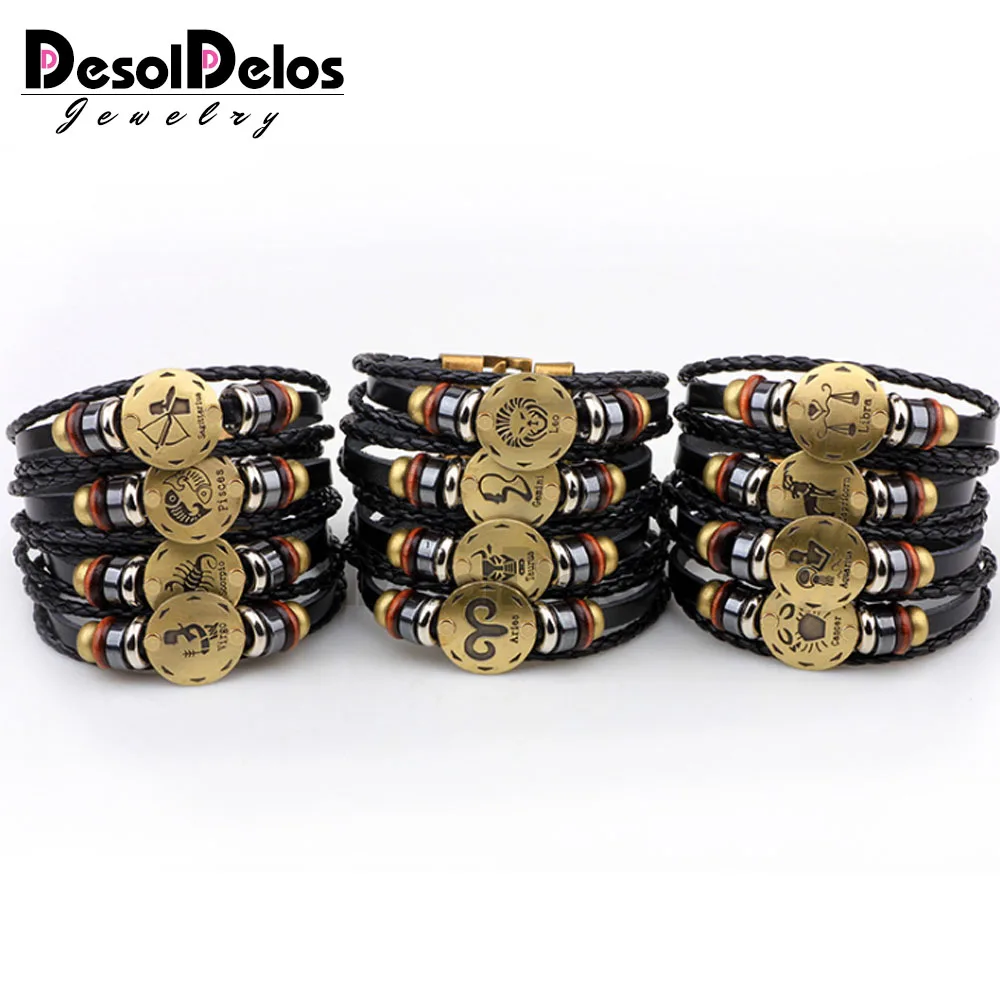 12 созвездий браслеты кожаный плетеный браслет-талисман цепочка манжета браслет для женщин и мужчин серебряный цвет браслеты, украшения