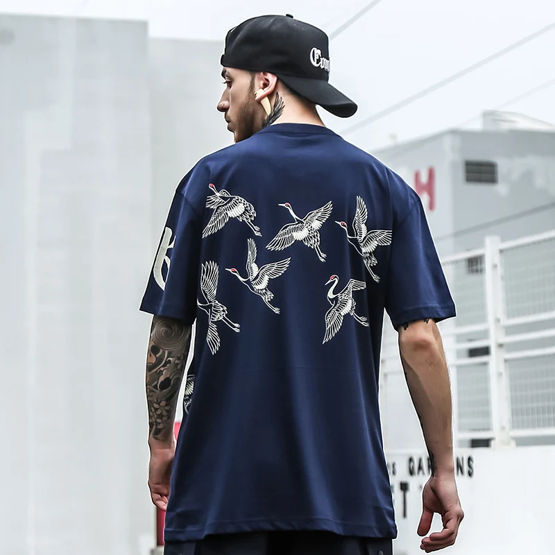 Мужская футболка в стиле Харадзюку, уличная Футболка с принтом журавлей и солнца, летняя хлопковая Футболка в стиле хип-хоп с короткими рукавами, черная футболка, 2019
