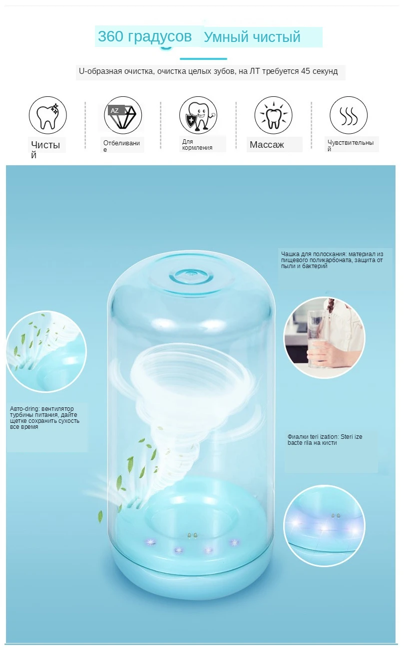 ❤Интеллектуальная УФ-дезинфекция: Магнитное зарядное основание. При зарядке УФ дезинфицирует зубную щетку, стерилизация