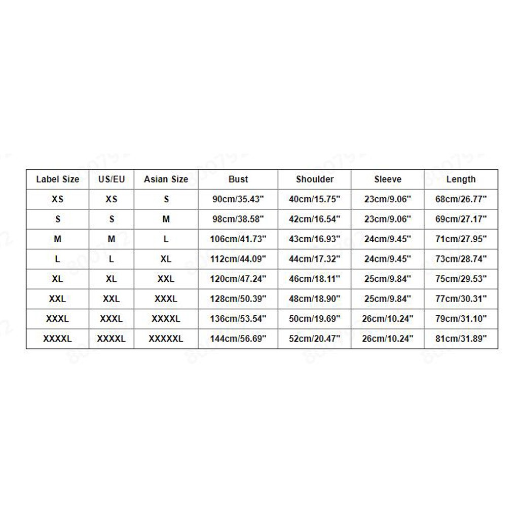 | Этикетка Размеры: XXXL | США/ЕС: XXXL | Азиатский Размеры: XXXXL | Обхват груди: 136 см/53,54 дюйма | Плечо: 50 см/19,69'' | Рукав: 26 см/10,24 дюйма | Длина: 79 см/31,10'' |