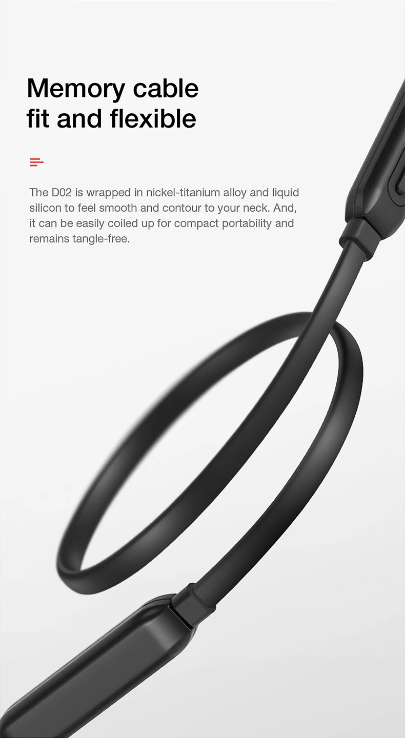D02 упакован в никель-титановый сплав и жидкий силикон, чтобы чувствовать себя гладким и контурным к вашей шее. И, он может быть легко свернут для компактной портативности и остается без спутывания.