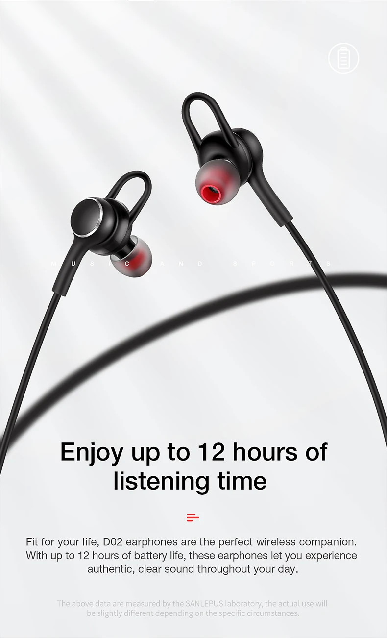 Подходят для вашей жизни, наушники D02 являются пертект беспроводным компаньоном. Эти наушники до 12 часов работы от аккумулятора позволяют вам наслаждаться аутентичным, чистым звуком в течение всего дня.