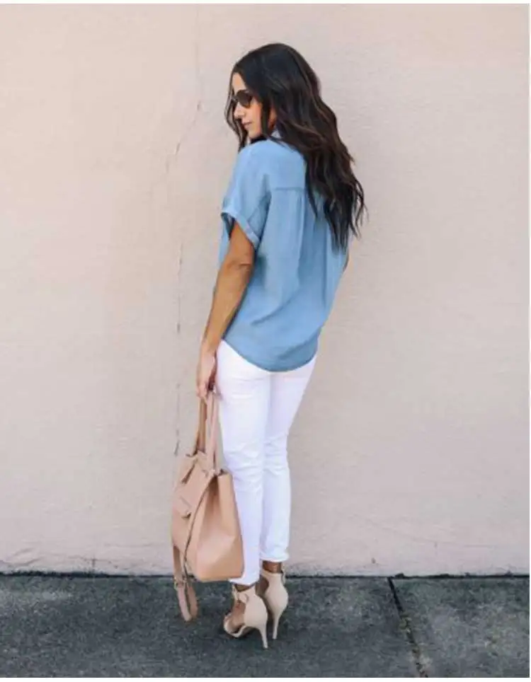 Женская сексуальная голубая легкая джинсовая рубашка с коротким рукавом и галстуком-бабочкой, джинсовая футболка, летняя уличная одежда, повседневные тонкие топы с карманами
