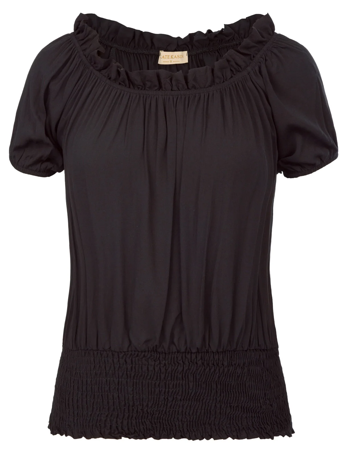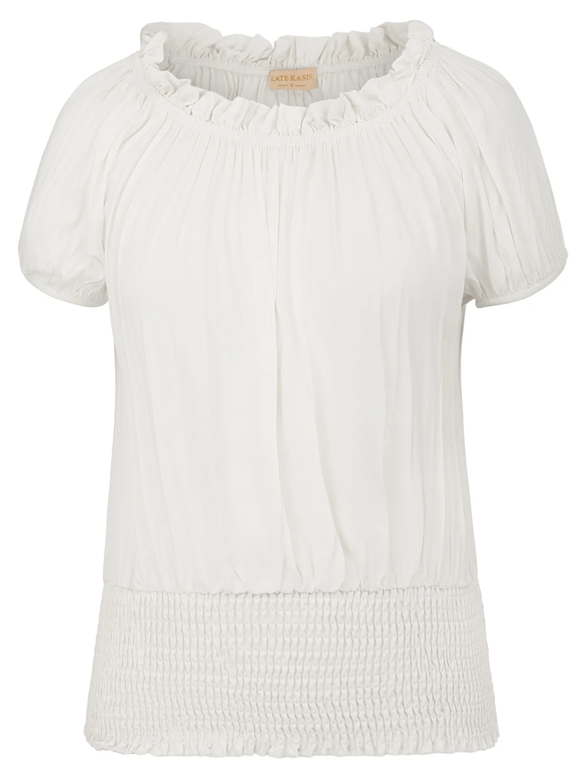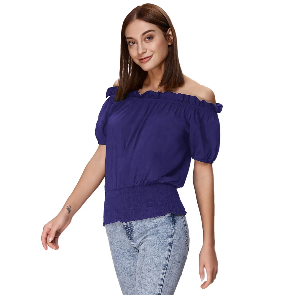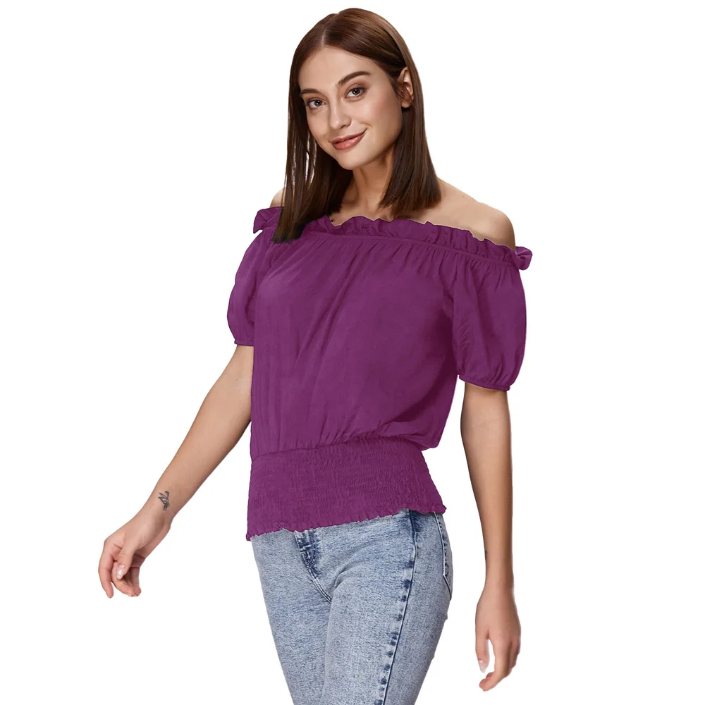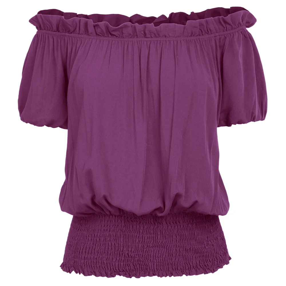 1)Короткий рукав с эластичными манжетами 2)Дизайн с открытыми плечами, также можно носить как топы с вырезом лодочкой 3)Вырез с эластичной резинкой 4)Свободный крой 5)Мягкая и удобная вискозная ткань 6)Присборенная Талия |