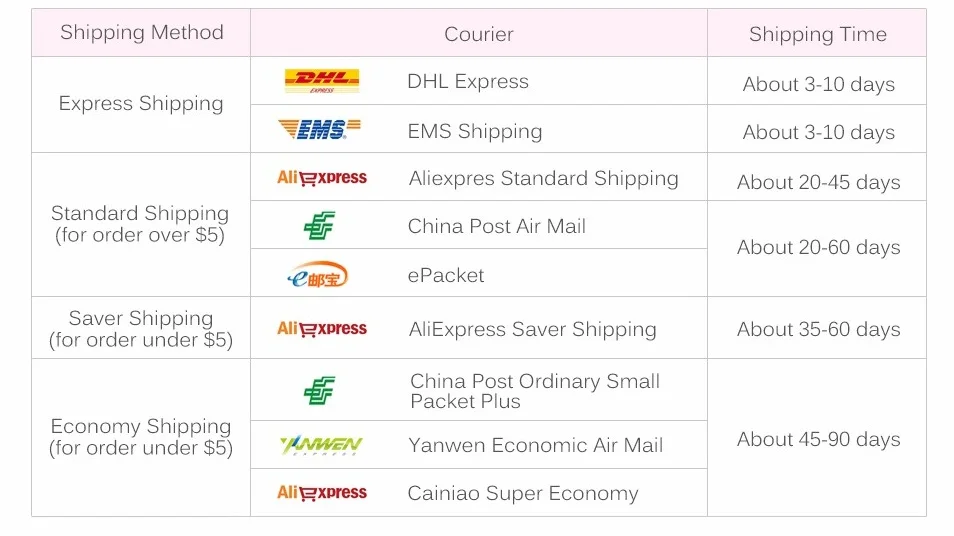 Способы оплаты: Перед размещением заказа, пожалуйста, подтвердите детали с нами, если у вас есть запрос на продукт. Пожалуйста, сделайте оплату в течение 3 дней после заказа, если это возможно. Отгрузка: 1. Сроки подготовки: для подготовки вашего заказа нам понадобится от 3 до 5 рабочих дней, в зависимости от количества получаемых заказов. 2. Пожалуйста, дважды проверьте свой адрес, когда вы пишете в aliexpress, если вы хотите изменить, прежде чем мы отправим их, пожалуйста, обратите внимание на новый адрес. Отслеживания посылки: Если вы хотите отследить свою посылка, вы можете выбрать следующую ссылку, чтобы проверить логистическую информацию вашей посылка. //www.17track.net/zh-cn Оценка: Если вы удовлетворены нашей продукцией, вы можете дать нам хорошую оценку. Спасибо!