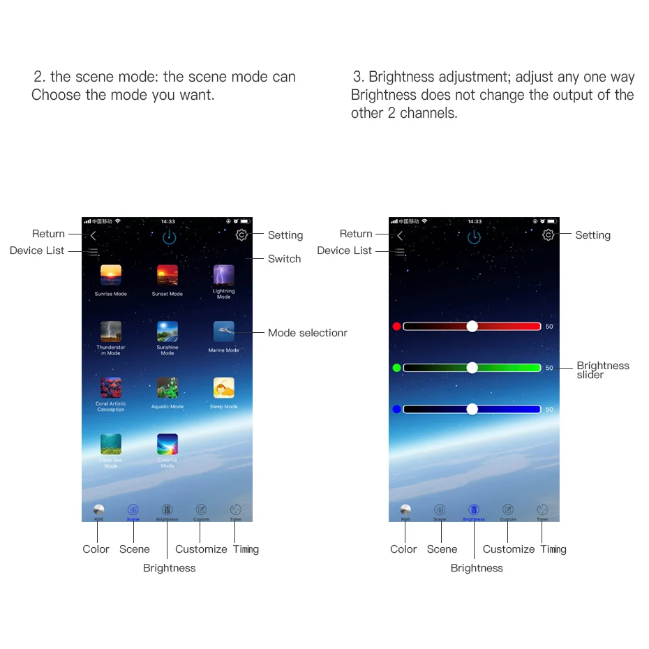 2. Режим сцены: режим сцены может выбрать режим, который вы хотите. 3.Brightnedd Регулировка: регулируйте в одну сторону яркость не меняется выходному проводу другие 2 канала.