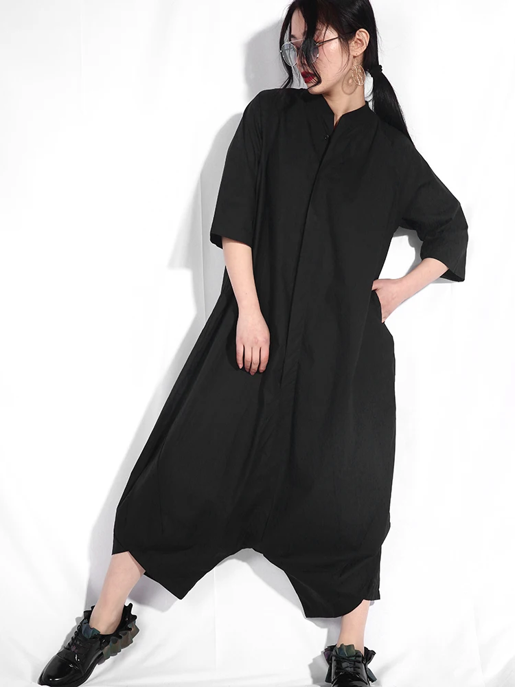 QING MO женский черный однотонный комбинезон с коротким рукавом длиной до щиколотки
