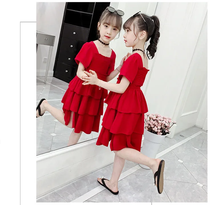 Мода 2019 года; однотонные хлопковые многослойные платья с короткими рукавами для девочек-подростков; праздничное летнее платье; одежда для детей