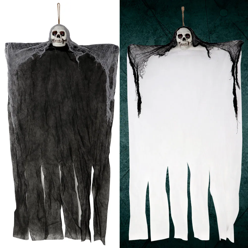 Упаковочный лист: 1 шт Хэллоуин висит призрак Цвет: черный + белый Материал: ПВХ + ткань Применение: украшения на Хэллоуин, вечерние.