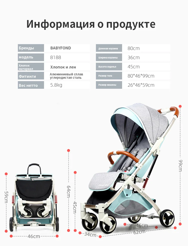 Упаковка: Детская коляска * 1 + 8 шт. в подарок (хлопковая подкладка, летний коврик, москитная сетка, подстаканник, ремешок на запястье, сумка для хранения, дождевик, подлокотник, только Золотая оправа и серебристая оправа имеют дождевик) Продукт Особенности: 1. Светильник с алюминиевой рамой, складной, Бесплатная установка 2. Коляска может быть легко упакована и имеет небольшую посылка по размеру. Это светильник, который удобно переносить в самолет. Вес данного коляска как светильник как 5,8 Кг. 3. Ручка и ручка сделаны из искусственной кожи, которая удобна в чистке. Весь тканевый чехол можно снять и очистить 4. Складной навес защищает ребенка от воздействия солнца. 5. Вращение переднего колеса на 360 градусов, с ориентацией и тормозом. Двойная система демпфирования, более стабильная реализация 6. Спинка может регулироваться до трех градусов, что отвечает различным потребностям ребенка. Может сидеть, может лежать, максимум можно отрегулировать до 170 ° Детали: Размер коляски: 80*46*99 см Размер в сложенном виде: 26*46*59 см Подходящий возраст: 0-4 года В большинство стран ЕС нет налога: DE,GB,FR,ES,BE,IT,NL,PL,CZ,LU,PT,IE,SE,AT,DK,FI,GR,HU,LT,LV,RO,SK И в Россию, у нас также нет налога. В Японию, Корею покупатель может выбрать EMS, всего 3-7 дней.