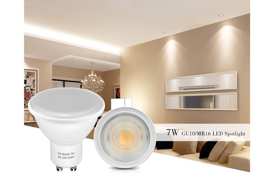 Технические характеристики: Тип цоколя: GU10/MR16 Напряжение: ac220в (AC200V-240V) Материал корпуса: Прочный термостойкий огнеупорный пластик алюминиевый материал Мощность: 7 Вт (честная мощность) Световой поток: 650LM Цвет и температура: Теплый белый (2800-3200 K); белый (6000-6500 K) Тип светодиодов: 2835SMD (высокая яркость) Ультратонкое естественное освещение CRI> 80 Угол луча 30/120 градусов (Чип на плате) Срок службы: 50000 часов Сертификаты: CE, ROHS