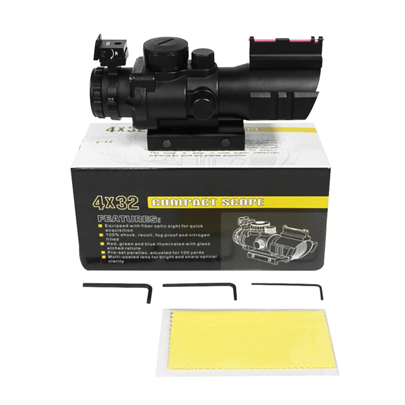 Оснащен волоконно-оптическим зрением для быстрого приобретения 100% шок, отдачи, огнестойкий и заполненный азотом Двойная подсветка со стеклянной окантовкой Предварительно установленный paeallax, отрегулирован на 100 ярдов Многослойные линзы для ярких и оптических линз shapp Спецификация: W/волоконно-оптический прицел Увеличение: 4x Диаметр объектива мм: 32 Подсветка: красный/зеленый/синий Отделка: Черный Выходной зрачок (дюйм):8 FOV DEGREEN:7 Поле обзора футов/100 ярдов: 36,6 Лен покрытие: Зеленый Длина дюймы: 5,5" MOA:1/4