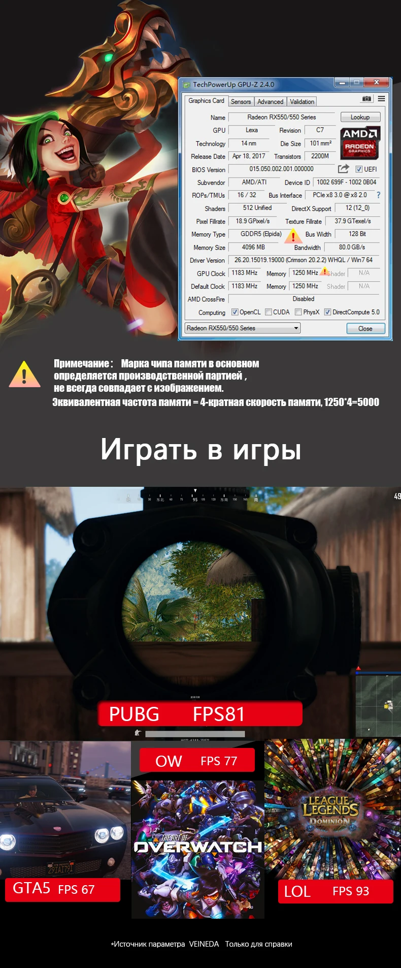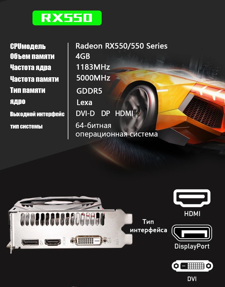 Описание товара: • 100% серия Radeon RX 550 /550 100% RX550 4 Гб • 100% протестированная работа перед отправкой • 100% натуральная 4 ГБ GDDR5 128 бит • Графический процессор: lexa • Частота сердечника: 1183 МГц • Частота памяти: 5000 МГц • Тип интерфейса: PCI Express 3,0 16X • Интерфейс ввода/вывода: HDMI DVI DisplayPort • 3D API: DirectX 12, • Поддержка HDCP: Да • Рекомендуемая мощность: 400 Вт выше Система поддержки: Windows 7(64 бит) ,Windows 10(64 бит) Обратите внимание: размер и цвет печатных плат в основном зависит от партии продукции, не всегда то же самое.