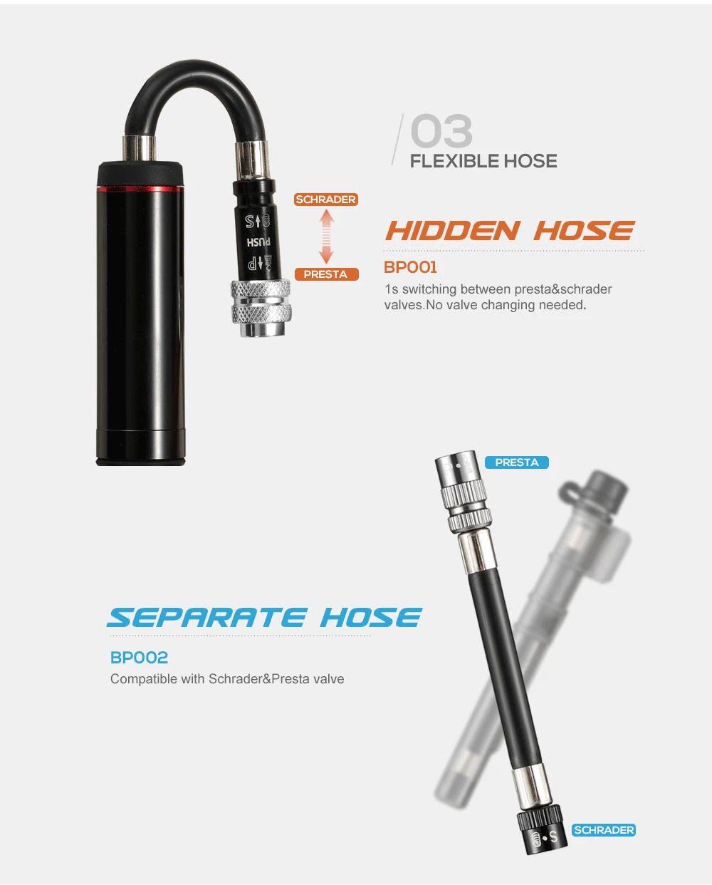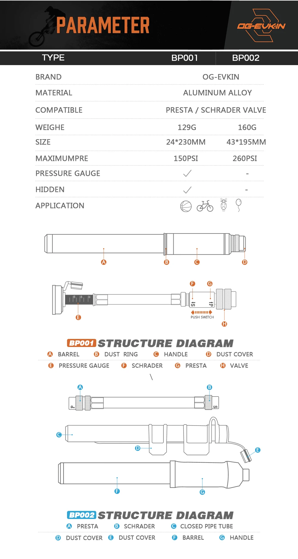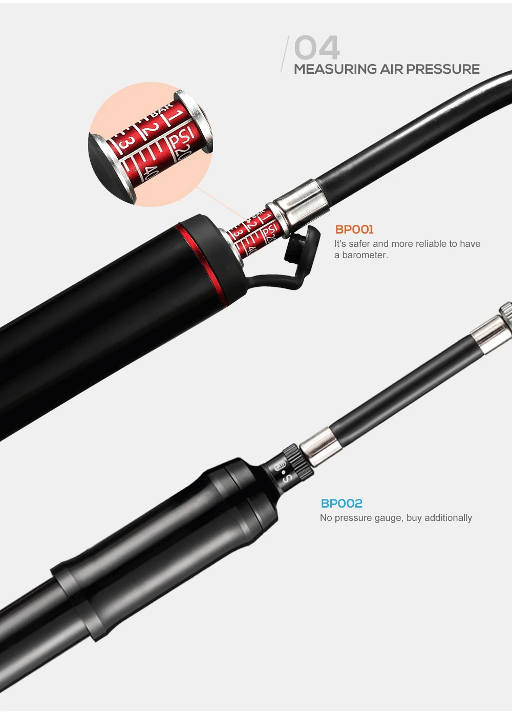 Модель: BP001/BP002 Материал: клапан Presta/Schrader Вес: 129 г/160 г Размер: 24x230 мм, 43x195мм Макс: 150psi, 260PSI