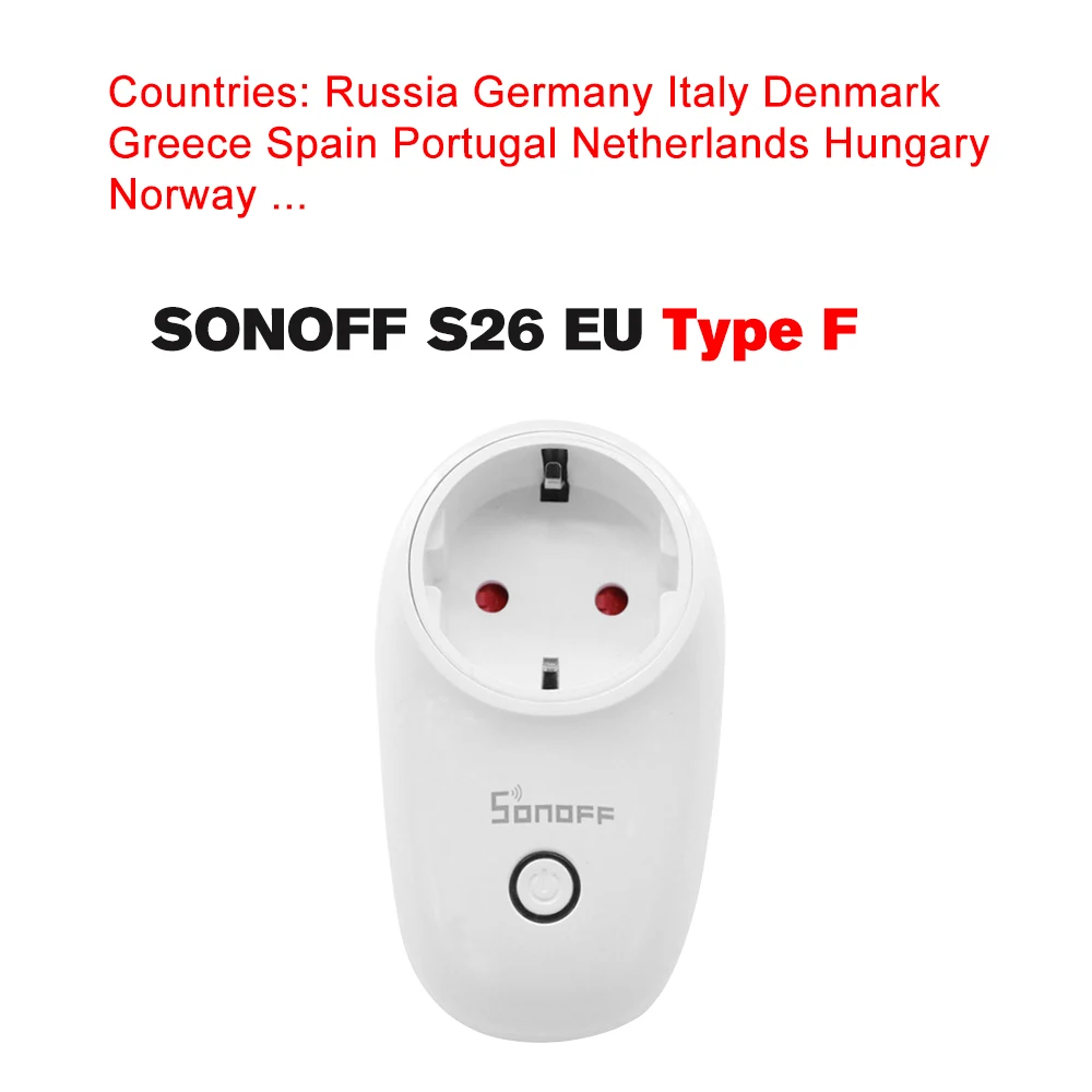 Примечание: SONOFF S26 Тип ЕС F: подходит для России/Германии/Италии/Дании/Греции/Испании/Португалии/Нидерландов/Германии/Норвегии...