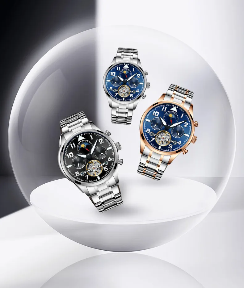 Часы скелетоны Мужские механические полностью стальные золотистые черные C1284|watch