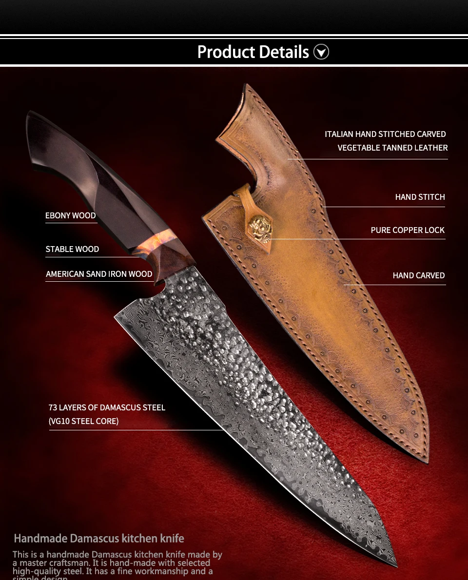 1. Лезвие: ручная кованая Дамасская сталь 2. Ручка: Эбеновое дерево + стабилизированное дерево + железное дерево пустыни 3. Оболочка: ручная работа из кожи растительного дубления 4. Твердость: 60 ± 1HRC 5. Термообработка: вакуумная термообработка 6. Упаковка: Подарочная коробка 7. Размер: Общая длина: 34 см Длина лезвия: 21,5 см (8.5in) Ширина лезвия: 5,6 см (2.2in) Толщина лезвия: 2 мм (0,08 дюйма) Вес: 193g (6,8 oz) * Данные измеряются вручную, допускается небольшая погрешность.
