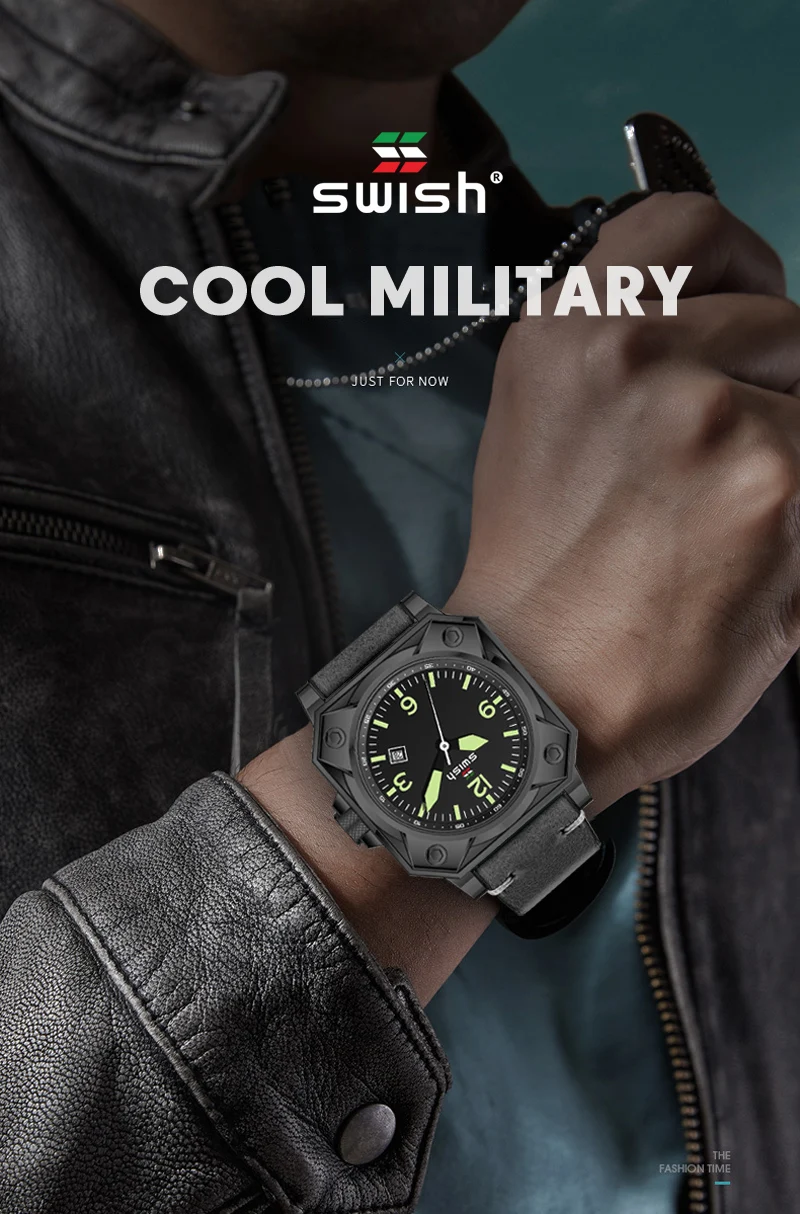 Квадратные мужские часы люксовый бренд SWISH черный кожаный ремешок из нержавеющей стали Спортивные Наручные часы Кварцевые водонепроницаемые Relojes Hombre 2020