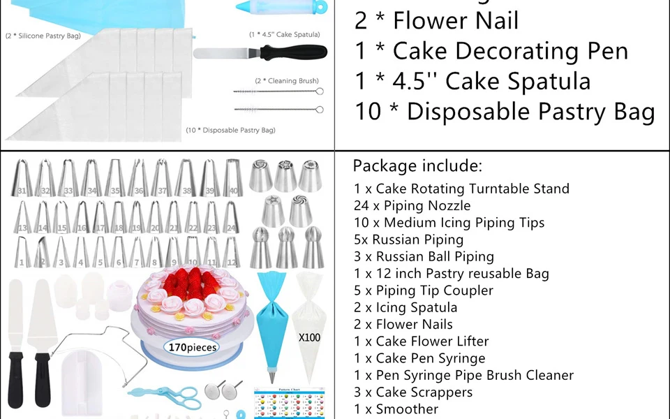 1. Набор насадок для украшения торта из нержавеющей стали, многоразовый, прочный и антипригарный, легко моется и обрабатывается. 2. Прочный, прочный, устойчивый к коррозии. Безопасный для всех потребностей в приготовлении пищи. 3. Прочный чехол для хранения хранит принадлежности для украшения тортов, защищенные в отдельных камерах и для использования. Удобный для хранения и защиты кондитерских наконечников в отдельных камерах, чистый и аккуратный. 4. Утилиты для выпечки, чтобы украсить ваши торты, кексы и печенье, подходит для профессионального использования или выпечки любимых DIY или детей начинающих.
