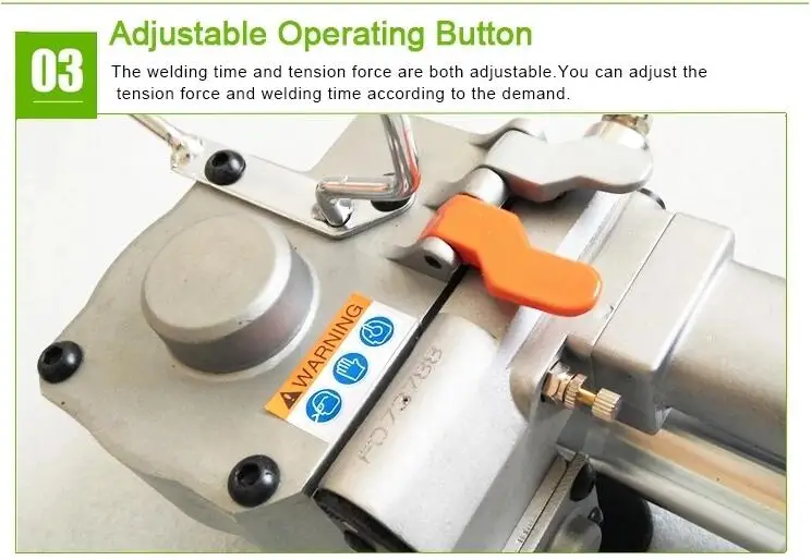 Модель: A-19/A-25 Давление воздуха: 0,5-0.8MPa(72-100PSI) Материал ремешка: полиэстер/ПП/ПЭТ Ширина ремешка: 19 мм/19-25 мм Толщина ремешка: 0,5-1,5 мм Напряжение: меньше 3500N Соединение: fricton сварного шва Регулировка диапазона времени сварки: 2-5 с Инструмент Вес: 3,8 кг Вес упаковки: 5,5 кг