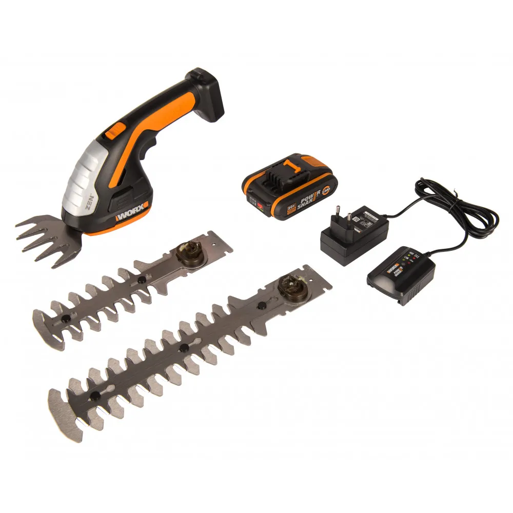 Устройство Worx WG801E представляет собой компактные и легкие аккумуляторные ножницы для резки травы, работающие от литий-ионного аккумулятора мощностью 20 В. В комплект поставки, помимо аккумулятора и зарядного устройства, входят также 3 режущих ножа/лезвия различной длины, которые могут быть легко заменены.