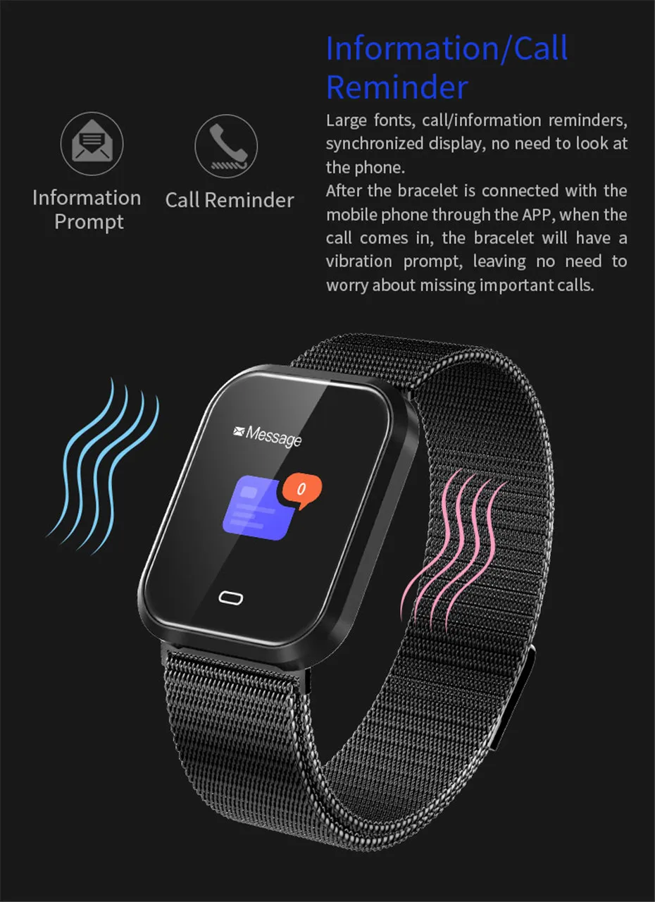 Язык поддержки приложения: русский, немецкий, итальянский, японский, французский, упрощенный китайский, традиционный китайский, английский, португальский, испанский, корейский, голландский Совместимая система: Android 4,4 и выше и iOS 8,2 и выше Датчик: датчик ускорения с тремя осями Чип: NRF52832 Уровень водонепроницаемости: IP67 профессиональный водонепроницаемый Датчик частоты сердечных сокращений: зеленый светильник, статический датчик частоты сердечных сокращений Вибрация: напоминание о вибрации в режиме реального времени (состояние соединения без bluetooth) Экран Размер: 1,3 дюймов IPS Тип экрана: 240*240 пикселей Bluetooth: низкое потребление Bluetooth 4,0 Синхронизация Внешний вид Материал: сплав и кремнезем Тип батареи: литий-полимерный аккумулятор Емкость аккумулятора: 200 мАч Срок службы: 4 дня Вес браслета: 50 г Способ зарядки: USB контактная зарядка Основные функции Непрерывной 24-часовой сердечный ритм тест измерять кровяное давление теста; Отображение времени/часов, один шаг, калории, расстояние, открытие/закрытие дисплея; Несколько спортивных режимов; Мониторинг сна (время сна, качество сна, день и ночь) Напоминание о телефоне, SMS напоминание, qq напоминание, микро напоминание, Skype, facebook, whatsApp напоминание; Найдите телефон, найдите часы, WeChat sports, экран запястья с ярким экраном; Будильник/лекарство/встреча/сидение/напоминание о напитке; Спортивные друзья и родственники, данные опроса, взаимное исследование.