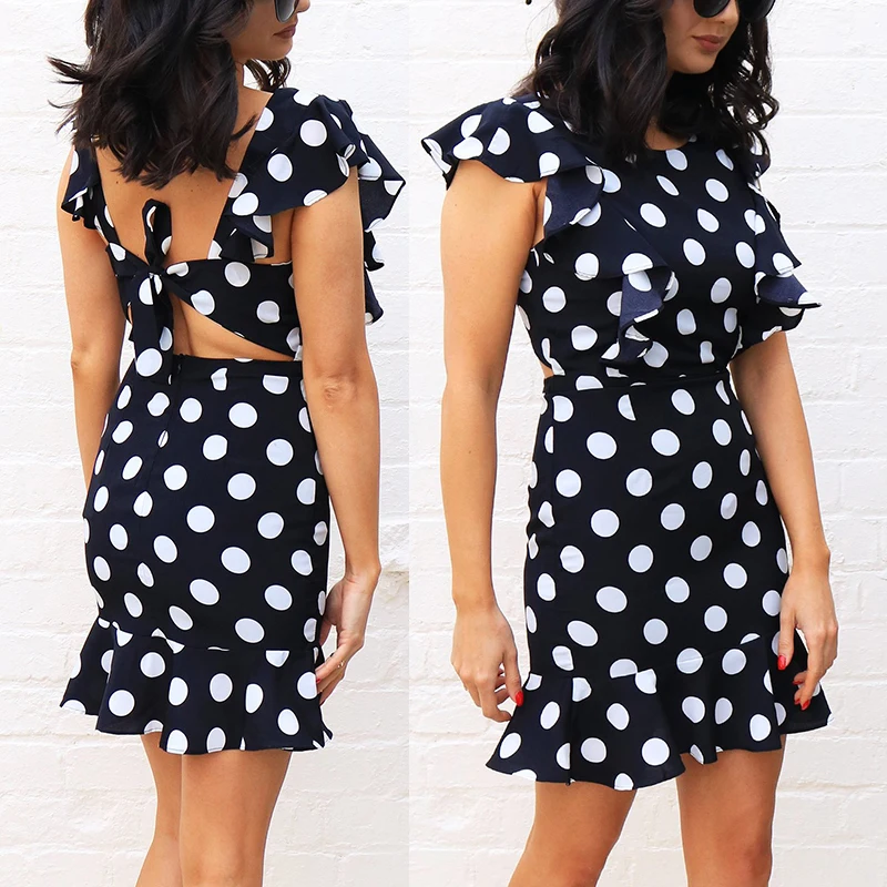 * Описание товара: Лето; горошек; гофрированное; Открытая спина; шнуровка; тонкий; облегающее платье