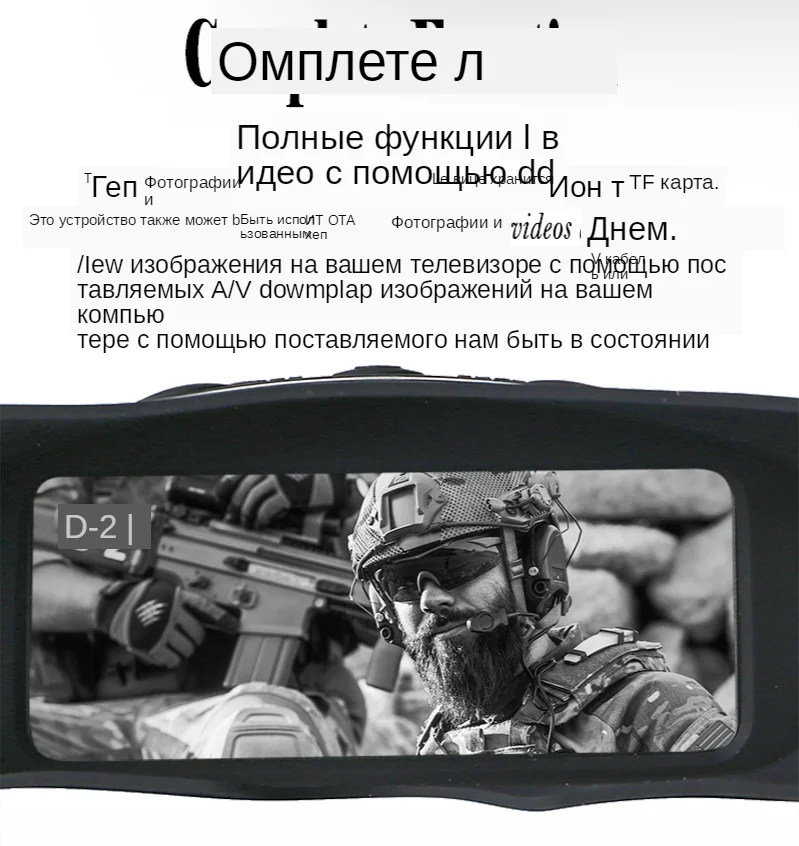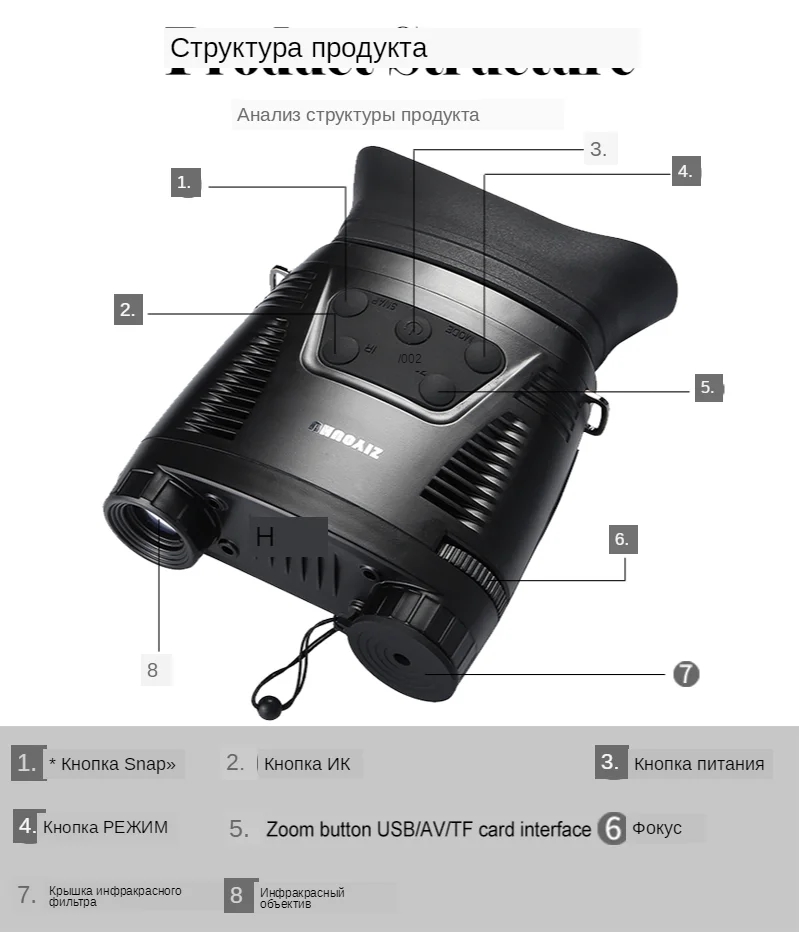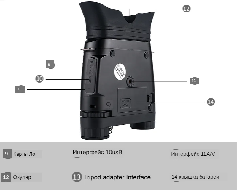 Каталог: описание функции Бренд/режим: ZIYOUHU, ZYH-NV200C Оптические характеристики Увеличение: 3,5 х 7 х 21 Цифровой зум: макс. 2x Угол обзора: 9° Диафрагма объектива: 21 мм Межзрачковое расстояние: 60 мм Номер f для объектива: 1.3 f От 3 м до бесконечности в дневное время (цвет); просмотр в темноте до 200 м (монохромный) Видеовыход; 320 x 240, разрешение TFT LCD 320 x 240 OSD-дисплей меню CVBS, всегда выход стандарта VGA с разрешением CVB Изображения Датчик высокой чувствительности КМОП 1/4'' Разрешение 640 х 480 ИК-светодиод; инфракрасный светодиод на 3 Вт с 850 нм Карта Micro SD; поддержка SDHC 4 ГБ и 32 ГБ; SD-карты Кнопки оборудования; включение/выключение Съемка Выбор режима Зум ИК-переключатель Работа; предварительный просмотр Запись файла AVI в хранилище SD Снимок файла JPEG в хранилище SD Воспроизведение файла мультимедиа из хранилища SD Мощность; внешний источник питания USB 5 В/1A 4 шт. батареи АА 4,5–6 В Срок службы батареи: 6 часов рабочего времени с выключенным ИК Предупреждение о низком заряде батареи Система; 4 режима (снимок, видео, воспроизведение, меню) Однокадровый снимок изображения Запись видеоизображения Воспроизведение изображения Удаление изображения 5 уровней ИК-переключателя для мощности USB, 3 уровня ИК-переключателя для батареи. Автоматическое отключение питания (Off (выкл.)/1 мин/ 3 мин/5 мин) Язык: английский /французский/ испанский/португальский/немецкий/9 ЯЗЫКОВ Режим ТВ (PAL/NTSC) Част. светового излучения 50/60 Гц Формат Яркость LCD 4 уровня регулировки LCD Версия Размер; 144 мм x 105 мм x 46 мм Вес 400 г (без батареи) Упаковка; USB-кабель / AV-кабель / карты Micro SD / сумка / руководство