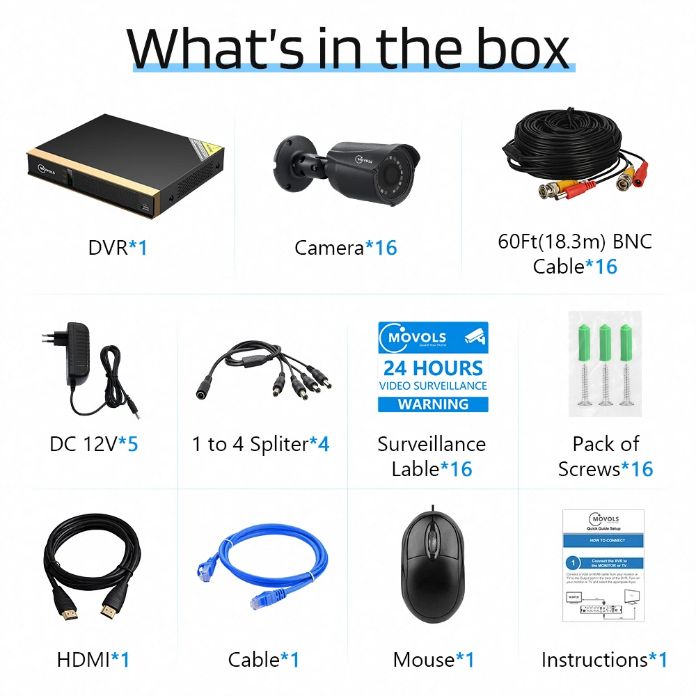 [16CH 1080P HD-TVI DVR/16 шт 1080P Всепогодная камера]-Получите четкое и четкое изображение днем или ночью с автоматическим ИК-фильтром камеры. До 65 футов ночного видения. Алюминиевый водонепроницаемый корпус, камеры можно использовать в помещении и на открытом воздухе[Настраиваемая зона обнаружения движения и оповещения]-- Быть уведомленным, когда есть непредвиденные движения. Смарт-уведомления с изображением будут перемещены на ваш смартфон через приложение. Вы также можете настроить зоны обнаружения с вашего видеорегистратора, чтобы минимизировать Ложные сигналы тревоги.[Просмотр из любого места в любое время]-Бесплатное приложение Movolview позволяет видеть все ваши камеры в одном месте. Зарегистрируйтесь дома или на работе, где бы вы ни были подключены к Интернету. Бесплатное приложение для просмотра в реальном времени и воспроизведения на умных устройствах с Wi-Fi или 2G/3G/4G в любом месте в любое время.