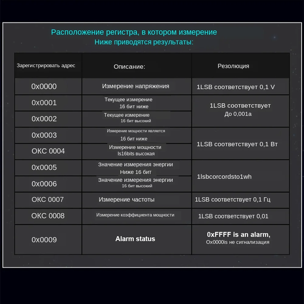 Модель: PZEM-004T A. Функция 1. Электрический параметр функции измерения (напряжение, ток, активная мощность). 2. Кнопка включения ясная функция. 3. Функция хранения данных с отключением питания (накопительная мощность до экономии). 4. Функция дисплея ПК (напряжение дисплея, ток, активная мощность). 5. Функция последовательной связи (поставляется с последовательным интерфейсом ttl, через различные клеммы связываются с адаптерной пластиной, считывают и устанавливают параметры). B. Передний дисплей и ключ Один. Пользовательский интерфейс Окно дисплея ПК состоит из четырех, использованных для отображения напряжения, тока, мощности, параметров питания, как показано на рисунке. Две. Формат дисплея 1. Мощность: диапазон измерения 0 ~ 22 кВт 0 ~ 10 кВт в формате дисплея от 0,000 до 9,999; В пределах 10 ~ 22 кВт Формат дисплея 10,00 ~ 22,00. 2. Мощность: диапазон измерения 0 ~ 9999квт · ч 0 ~ 10 кВт · ч в формате дисплея от 0,000 до 9,999; 10 ~ 100 кВт · ч в формате дисплея от 10,00 до 99,99; 100 ~ 1000квт · ч в формате дисплея от 100,0 до 999,9; 1000 ~ 9999квт · ч и выше формата дисплея от 1000 до 9999. 3. Напряжение: диапазон тестирования 80 ~ 260В переменного тока Формат дисплея 110,0 ~ 220,0. 4. Ток: диапазон измерения 0 ~ 100A Формат дисплея от 00,00 до 99,99. Три. Кнопка Встроенная кнопка на панели, используемая для очистки электричества, как показано на рисунке 2. Метод очистки электричества: Нажмите кнопку ZERO пять секунд, затем отпустите кнопку! Нажмите еще раз, чтобы очистить ключ, данные очищены и выключены, очищены до сих пор. C. Серийный Связь Модуль оснащен ttl последовательным интерфейсом передачи данных через последовательный порт можно считывать и устанавливать соответствующие параметры; но если вы хотите устройство с USB или RS232 (например, компьютеры) для общения, то вам нужно быть оснащен различными TTL адаптер электронная плата (USB связь требует с ttl к USB адаптеру пластины; RS232 связь требует с ttl к RS232 адаптерной пластине), адаптер пластины конкретных деталей подключения можно найти на рис. D. Описание сообщений 1. Подключите оборудование в соответствии с схемой проводки. 2. подключите линию после того, как хороший первый выбор порта связи модуля программного обеспечения ПК поддерживает порт связи COM2 \ COM3 \ COM4, через менеджера устройств для просмотра, если не более нескольких портов, необходимо изменить порт. E. Соображений 1. Этот модуль подходит для использования в помещении, а не на открытом воздухе. 2. Применяемая нагрузка не должна превышать номинальную мощность. 3. Проводка не может быть неправильной. F. Технические характеристики 1. Рабочее напряжение: 80 ~ 260В переменного тока 2. Тестовое напряжение: 80 ~ 260В переменного тока 2. Номинальная мощность: 100A/22000 Вт 3. Рабочая частота: 45-65 Гц 4. Точность измерения: 1,0 Посылка содержание A: 10A модуль B: 10А модуль + ttl к USB C: 100A модуль + закрытый CT D: 100A модуль + открытый CT E: 100A модуль + закрытый CT + ttl к usb-кабелю F: 100A модуль + открытый CT + ttl к usb-кабелю Меры предосторожности 1. Этот модуль подходит для помещений, пожалуйста, не используйте открытый. 2. Применяемая нагрузка не должна превышать номинальную мощность. 3. Заказ на проводку не может быть неправильным. 4. Он не может быть использован для инвертора. Примечание: 1) убедитесь в использовании терминальной программы, поддерживающей шестигранную. Мы рекомендуем RealTerm, на tab [DISPLAY] выберите HEX [Space] 2) данные, которые должны быть отправлены, должны быть в гексадецима