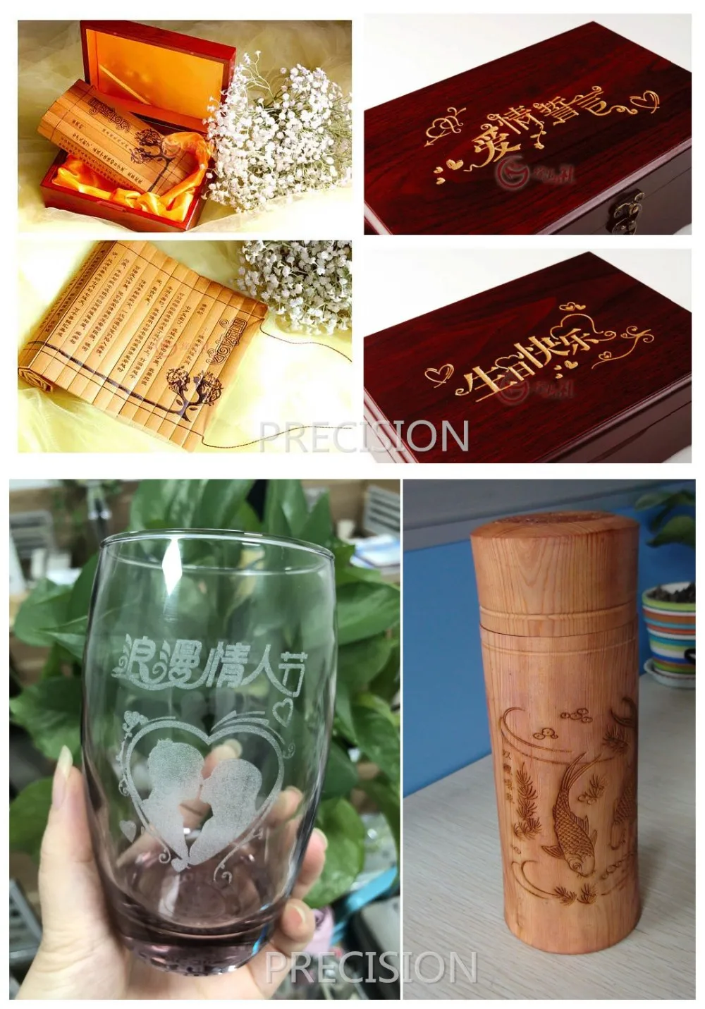 Бамбук, нефрит, мрамор, стекло, хрусталь, пластик, одежда, бумага, кожа, резина, керамика, твердая древесина, МДФ, фанера, оргстекло, пластик, акрил, И других неметаллических материалов. Также можно гравировать на металлы с использованием аддитивного лазерного маркировочного материала, такого как «Cermark».