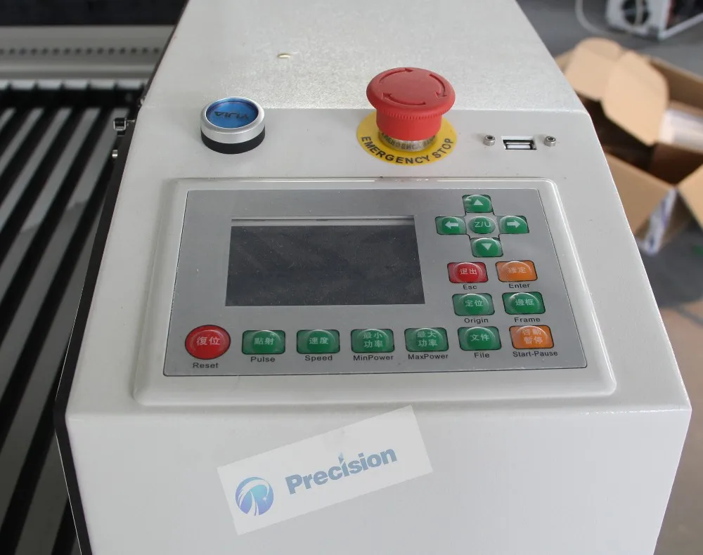 Ruida LCD панель управления позволяет пользователю быстро изменить выбранную программу и изменить рабочие условия машины. Вы можете запускать, останавливать, сбрасывать данные, тестировать огонь, выгравировать проектную площадь, перемещать ось X или Y, ЖК-дисплей, ось Z вверх/вниз, контроль внутреннего освещения, Аварийная остановка, блокировка операций с ключом