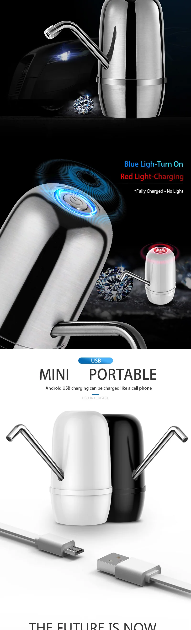 1. Электрический водяной насос с двойным насосом, двойной открытый для семьи, легко носить с собой. Двойной насос воды, двойное количество воды! Гальванизированный матовый металл 2. Android USB зарядный интерфейс, распределительный зарядный кабель, DC5V вход, 5 Вт Рабочая мощность 3. Пищевая силиконовая водопроводная труба (водопроводная труба может быть заменена через долгое время, более здоровая) 4. Есть полная Подсказка для зарядки, которая удобна и удобна.
