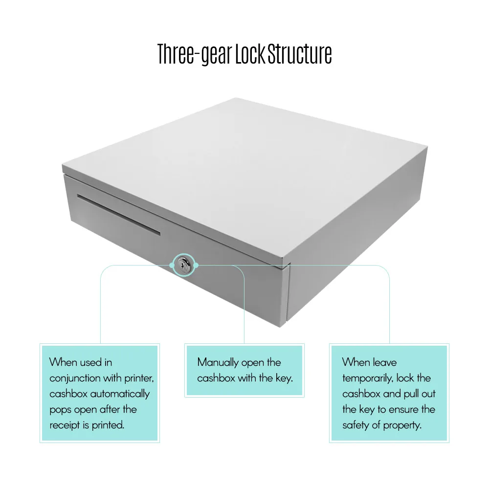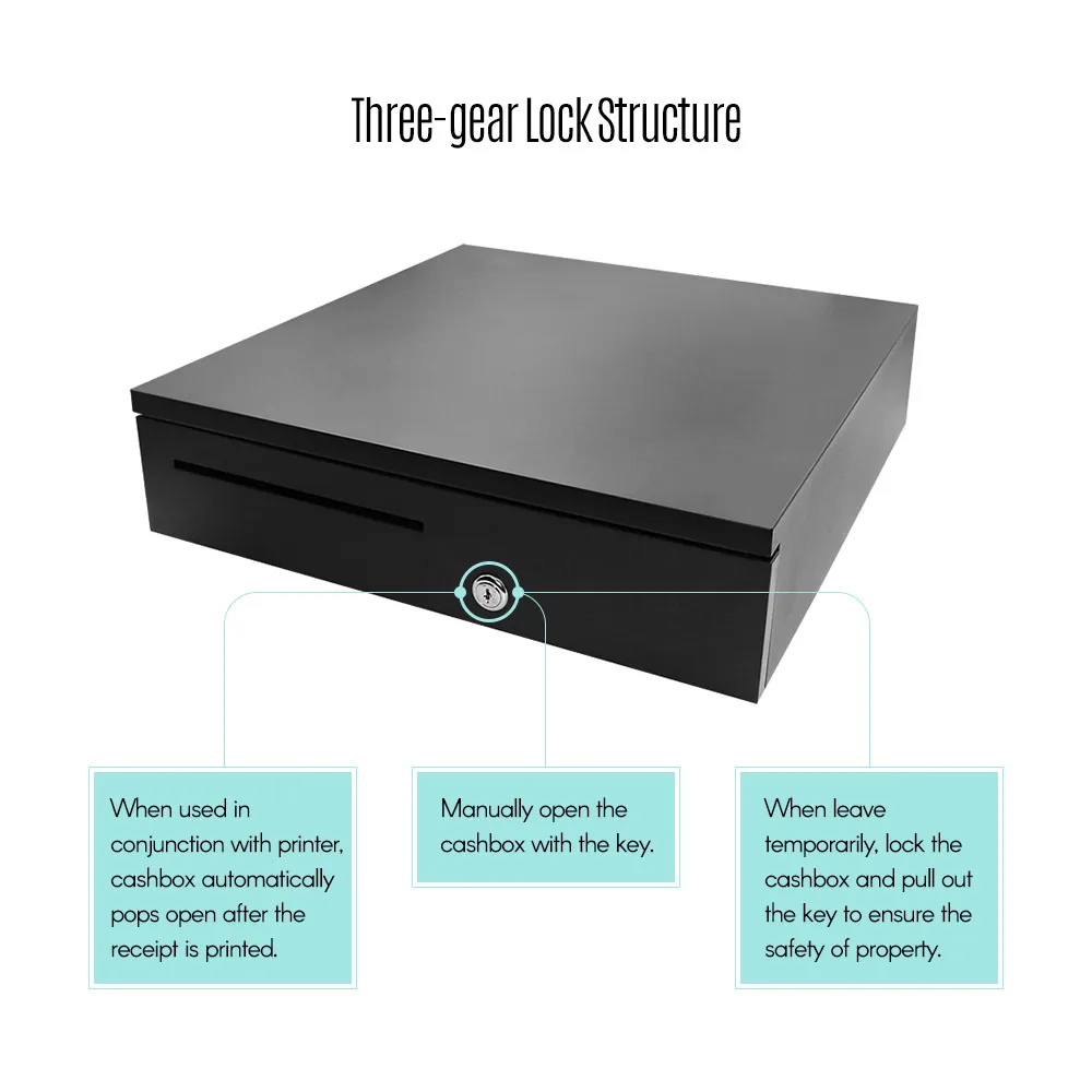 Трехзубчатая структура блокировки-при использовании в сочетании с принтером, кассовый бокс автоматически открывается после печати квитанции; Вручную Откройте кассовый ящик с ключом; Когда временно уйдете, заблокируйте кэшбокс и вытащите ключ, чтобы обеспечить безопасность собственности.
