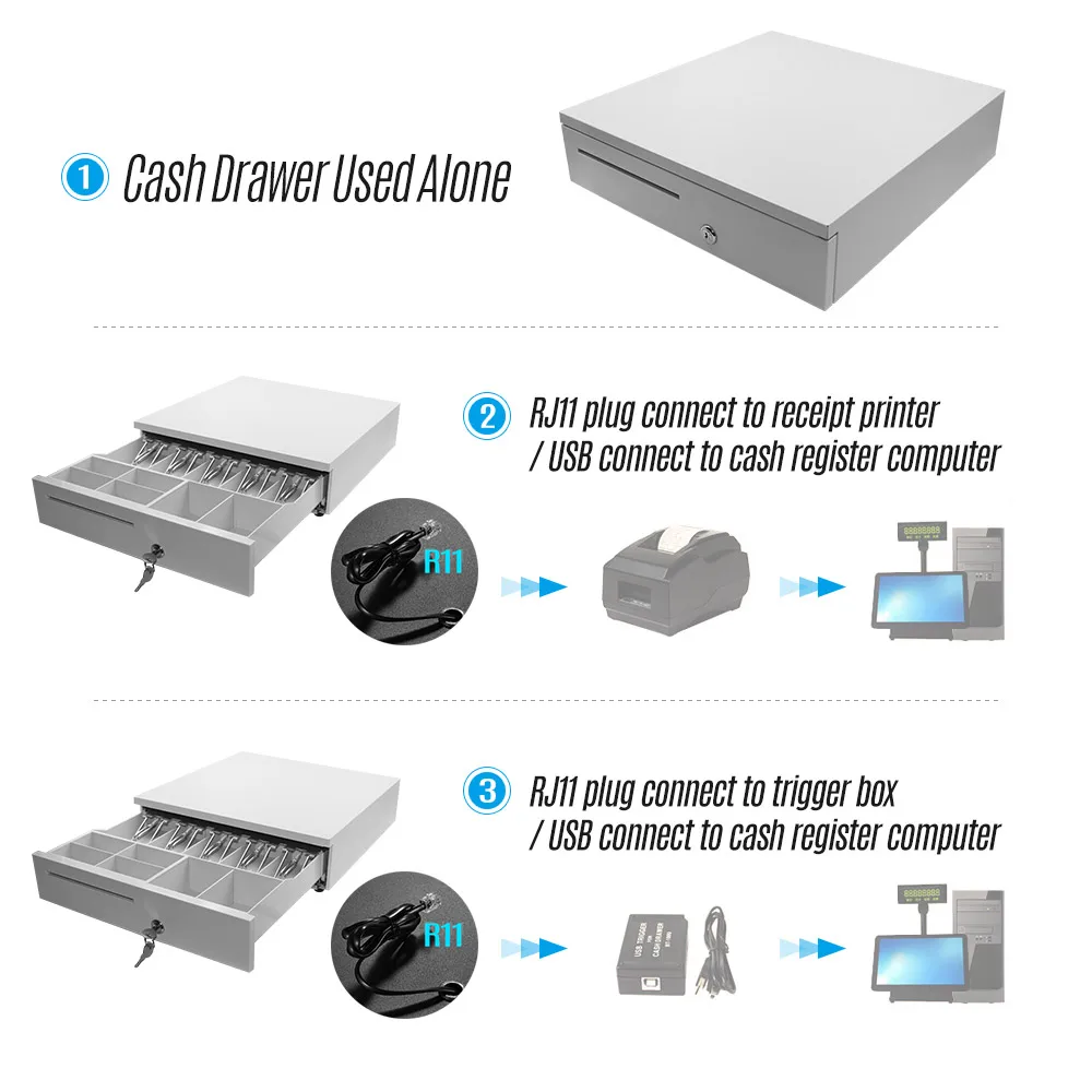 Три способа использования-Используйте только cashbox; RJ11 подключение к принтеру чеков и USB подключение к компьютеру кассового аппарата; RJ11 подключение к блоку запуска, а затем USB подключение к компьютеру кассового аппарата.