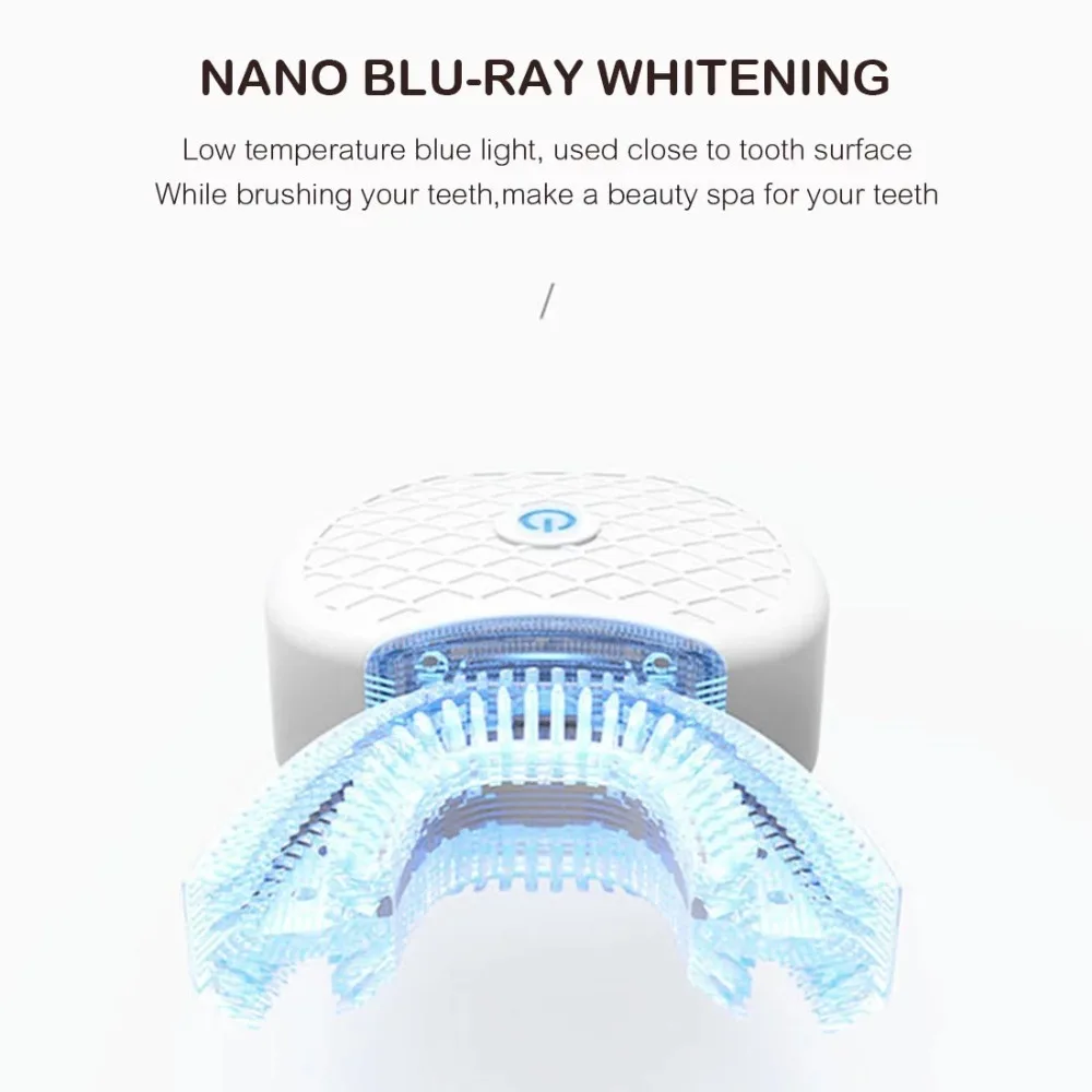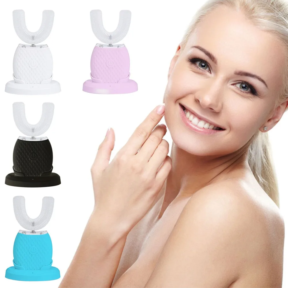360 градусов Умная Автоматическая звуковая электрическая зубная щетка u-типа 4 режима зубная щетка USB зарядка отбеливание зубов синий светильникОписание товара:Цвет: белый/черный/розовый/синийМатериал: силикон + АБСФорма: u-типУгол: 360 градусовЗарядка: usb-интерфейс для зарядки, беспроводная Индуктивная Зарядная базаРазмер продукта: около 1,2*2,6 * 4.5inВремя очистки: 45 секундВремя зарядки: 90 минутРежимы: четыре режима (режим мягкой очистки/режим сильной очистки/режим массажной резинки/Режим отбеливания)Частота: 5000-15000 раз/минВодонепроницаемость: IPX7