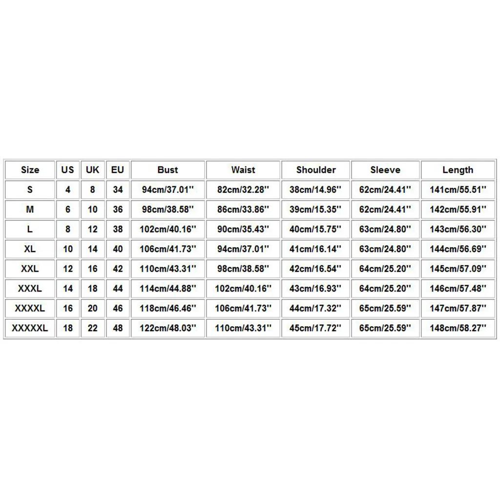 | Размеры: XXXXL | Свяжитесь с нами: 16 | Великобритания: 20 | ЕС: 46 | Обхват груди: 118 см/46,46 дюйма | Талия: 106 см/41,73 дюйма | Плечо: 44 см/17,32 дюйма | Рукав: 65 см/25,59 дюйма | Длина: 147 см/57,87'' |