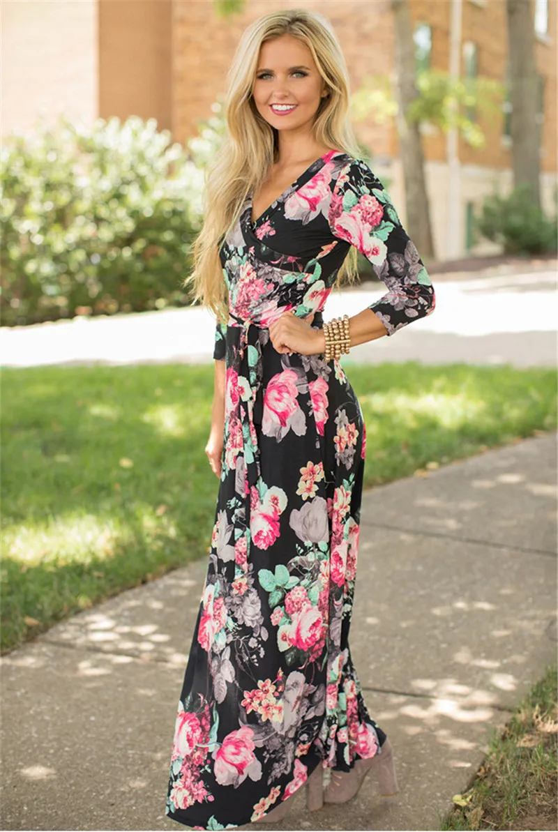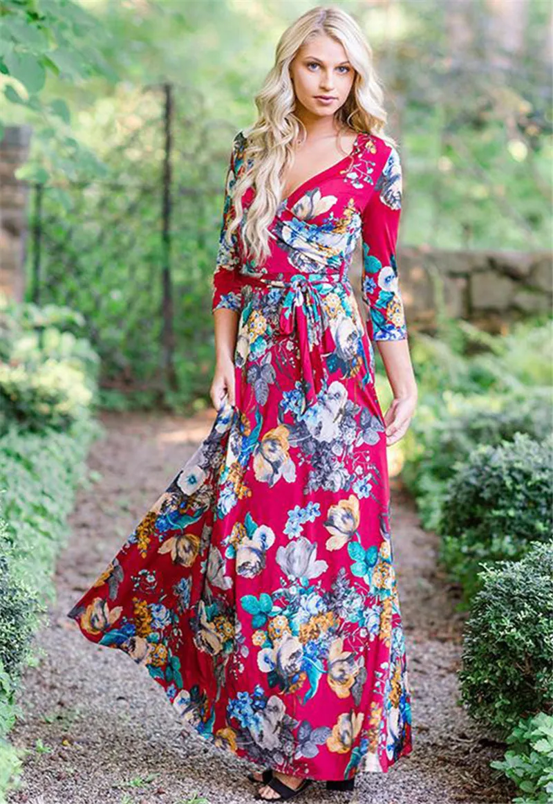 Винтажное длинное Бандажное платье, женское сексуальное вечернее платье с v-образным вырезом, пляжное макси платье, бохо, цветочное модное платье на бретельках с разрезом, сарафан