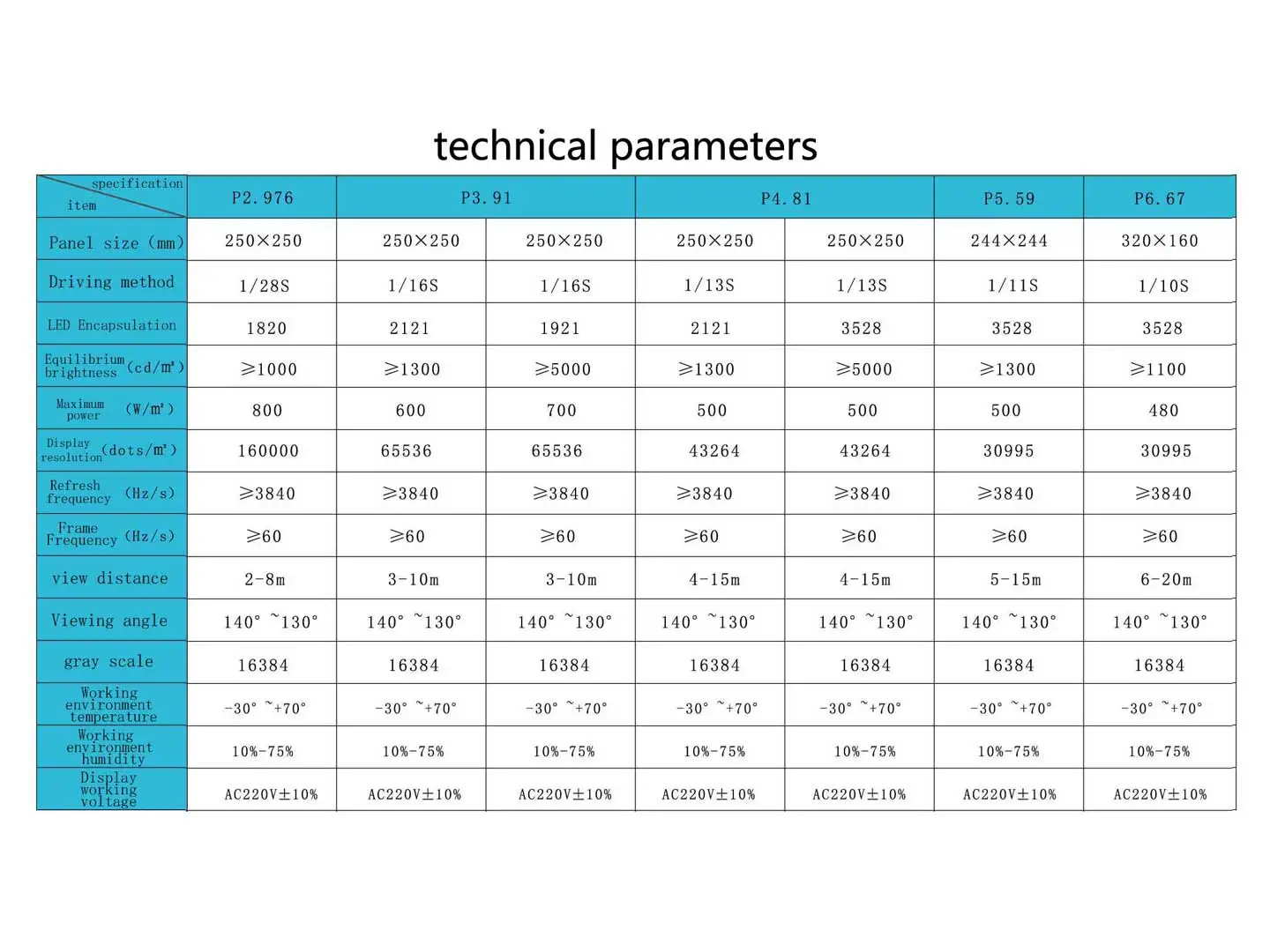 Товар P2.5 Чип Epstar Светильник SMD2121/1515 Шаг пикселя 2,5 мм Размер модуля 320mmx160мм Разрешение модуля 128X64 (точки) Плотность пикселей 160000 точек/м2 Конфигурация пикселей 1R1G1B Красная длина волны 625 ± 2 нм Зеленая длина волны 525 ± 2нм Синяя длина волны 470 ± 2 нм Цвета 16777216 Лучшее расстояние для просмотра ≥ 2,5 м Угол обзора 120 °/120 ° Максимальная потребляемая мощность 20 Вт Яркость 900cd/m2 Серые весы 14 бит одного цвета Цветовая температура 9000k Метод управления синхронизацией или асинхронизации Метод вождения 1/32 сканирования Частота кадра 60 Гц Частота обновления ≥ 1920 Гц Рабочее напряжение DC5V Класс IP IP54 Мтбф более 8000 часов Срок службы 80000 часов