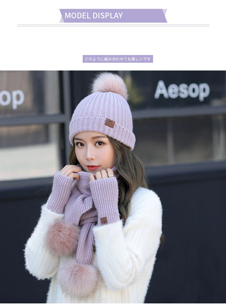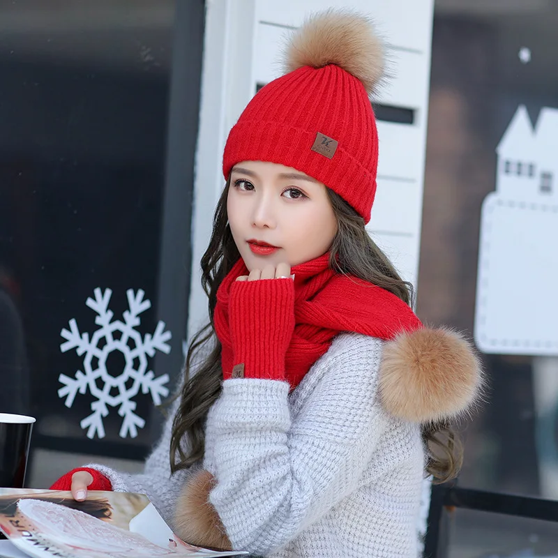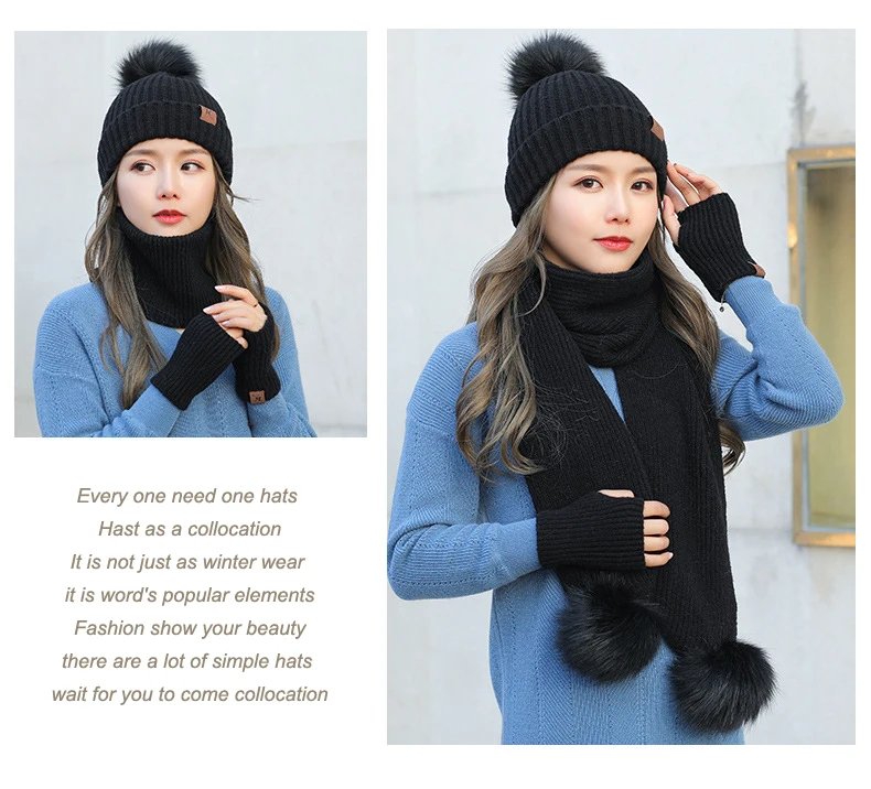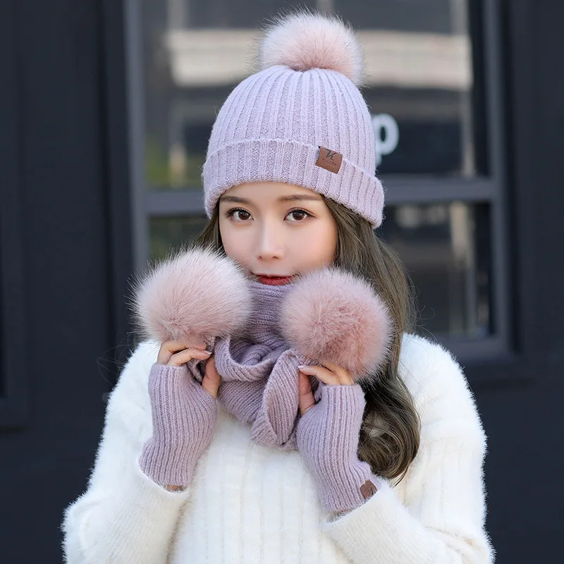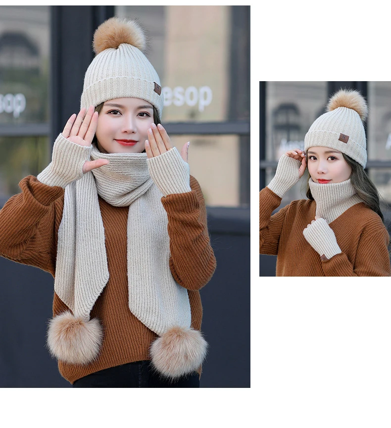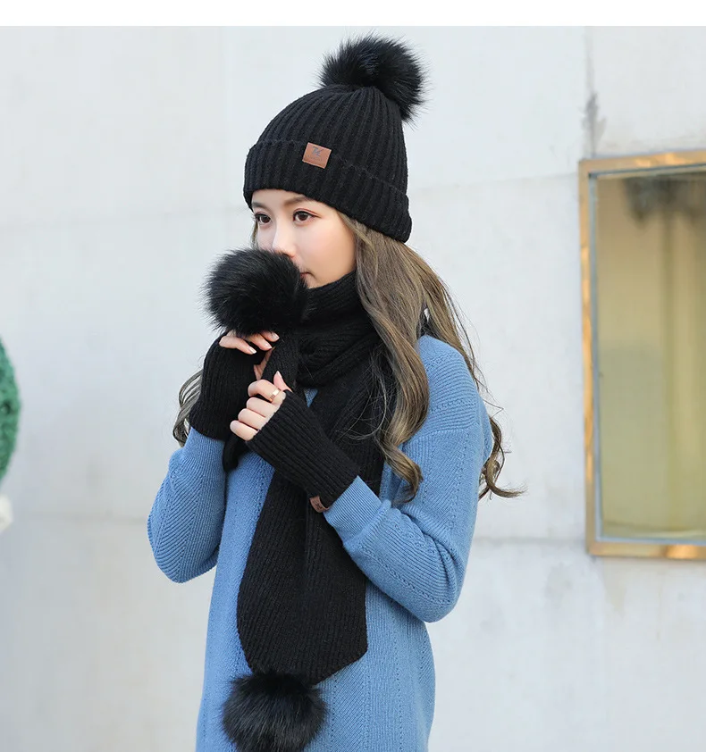 Женская вязаная зимняя шапка шарф перчатки 3 комплекта зимняя шапка с помпоном тюк Акриловые шляпы