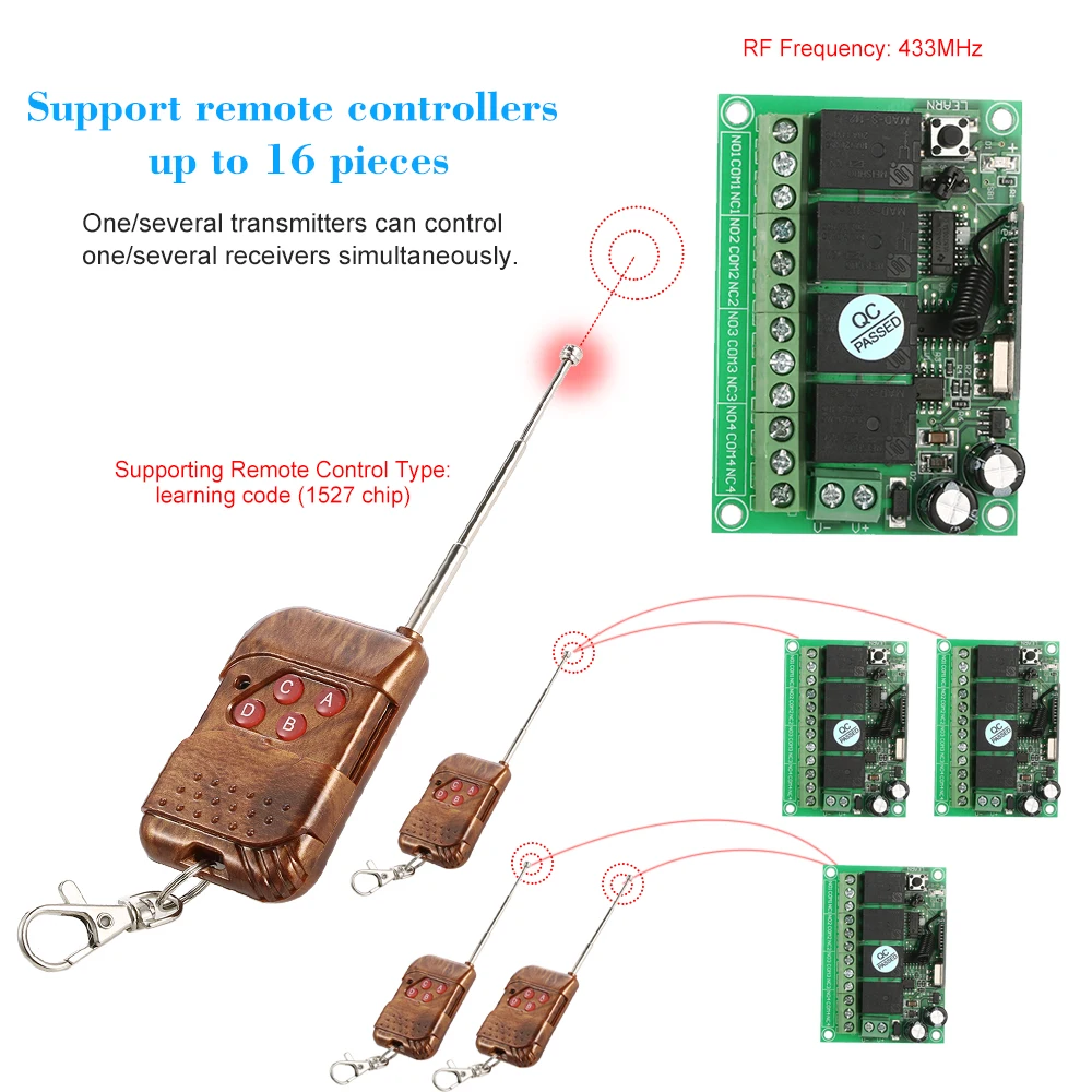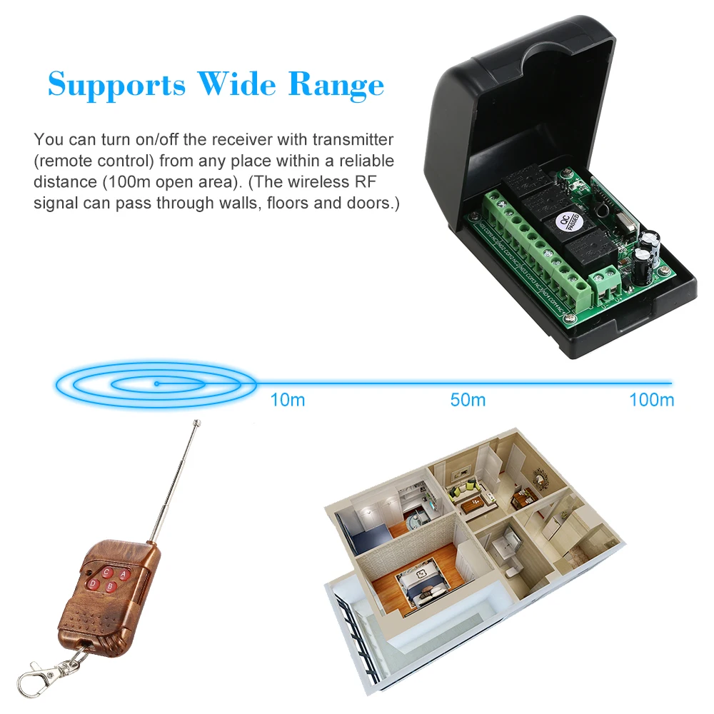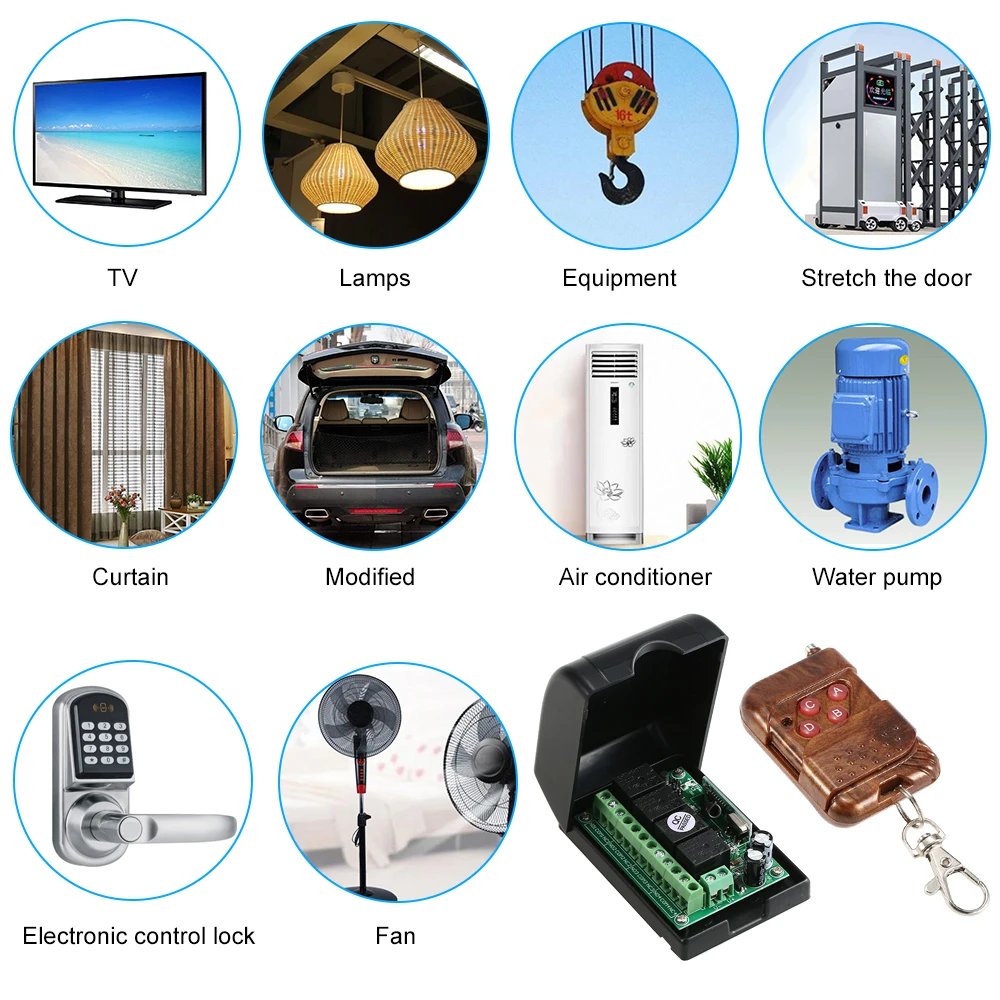 * Он может подключаться к электронному замку управления, светильник, вентилятор, окно, занавес, двигатель, автомобиль, подъемное устройство, управление двигателем, управление подъемником или другие приборы с AC85V-250V или DC12V. Чтобы он мог дистанционно разблокировать дверь, закрыть светильник, открыть или закрыть занавеску и т. д.