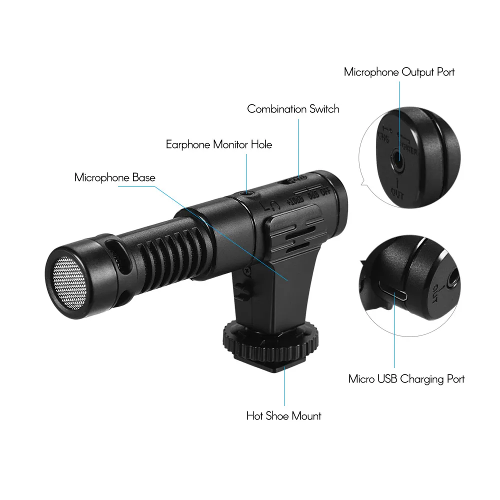 Микрофон со съемной основой для крепления на горячий башмак камеры; с разъемом 3,5 мм для вставки смартфона непосредственно.