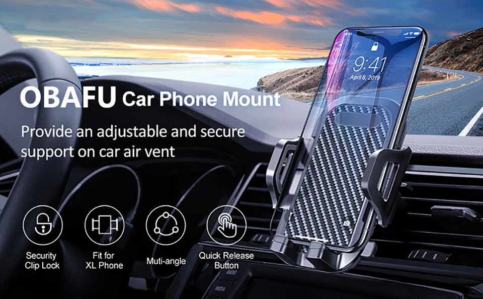 Автомобильное крепление для телефона OBAFU обеспечивает безопасное, универсальное и высокофункциональное решение для крепления смартфона. Крепление крепится к вентиляционным отверстиям вашего автомобиля с помощью зажима, и он захватывает ваш телефон без использования каких-либо магнитов. Между тем, ваш вид дороги не влияет. Защищен ли ваш телефон, используя кожу или чехол, автомобильный держатель телефона OBAFU надежно крепится на ваше устройство, чтобы вы могли уверенно управлять им.