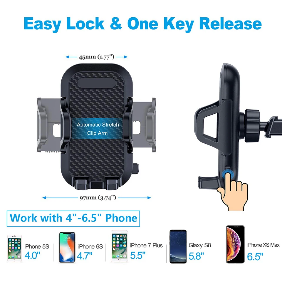 Нажмите кнопку на правой стороне автомобильного крепления телефона, чтобы открыть зажимы и быстро отпустить телефон от крепления. Его рукоятка с когтями значительно расширяется, чтобы вместить широкие фаблеты, такие как для Galaxy S9 +.