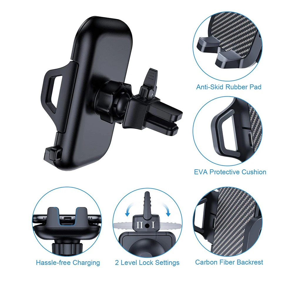 Этот держатель телефона для автомобиля обеспечивает функцию блокировки 2 уровня вместе с силиконовыми прокладками, которые помещаются на соединительные руки, чтобы предотвратить повреждения, а также минимизировать вибрации устройства. Прикрепите к вентиляционному отверстию и Защитите лобовое стекло от любых препятствий. С крепким зажимом и двухуровневым безопасным замком, наш автомобильный держатель обеспечивает плотно улучшенное сцепление с лезвиями вентиляционного отверстия вашего автомобиля.