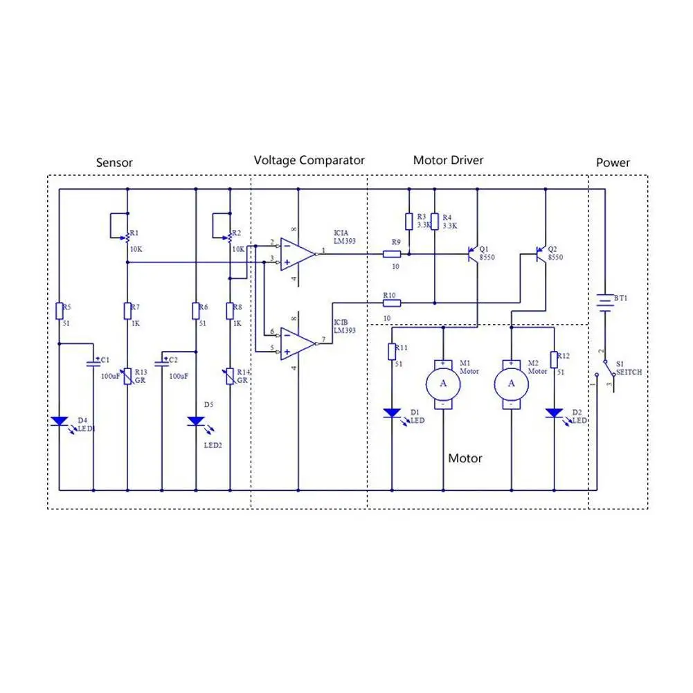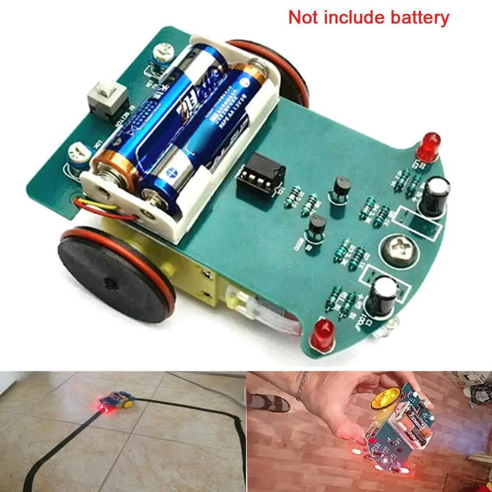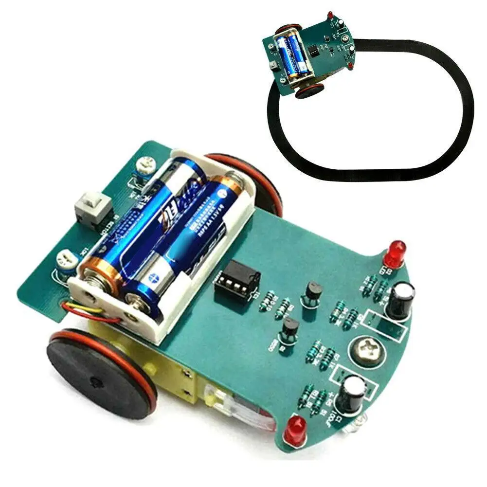 Описание: характеристики: Ширина дорожки: 15 мм Цвет: Как показано размер (Длина x Ширина): appr. 10x7 см Мощность: 2 x AA Напряжение батареи: 3 в шаги сборки: Шаг 1: сварочная электрическая сварочная деталь проще, последовательность сварки в соответствии с принципом уровня компонентов от низкого до высокого, первое сопротивление сварки 8, важно использовать мультиметр для подтверждения правильности сопротивления, D4, D5 R13 R14 может временно не сваривать, микросхемы интегральной схемы временно не вставляются Шаг 2: механическая сборка красная линия подключается к положительному источнику питания 3 В, желтая линия заземления, избыточный провод используется для мотора. Шаг 3: установка фоточувствительного сопротивления фотоэлектрической цепи и диодов, излучающих светильник (полярность Примечания), устанавливается на печатной плате, а расстояние заземления составляет около 5 мм, как светочувствительная сопротивление и светильник-светодиоды 5 мм расстояние. Наконец, вы можете проверить мощность. Шаг 4: отладка транспортного средства правильное направление находится вдоль универсального направления колеса, если вы нажимаете и удерживаете левый фоторезистор, колеса на правой стороне автомобиля должны быть повернуты. Нажмите и удерживайте правый фоторезистор, колеса на левой стороне автомобиля должны быть повернуты, если автомобиль движется назад, также можно обменять проводку двух двигателей, если одна сторона Нормальная и другая сторона назад, пока вы можете поменять проводку задней стороны. Нажмите, чтобы посмотреть видео установки и отладки Примечание: батарея не включена. Посылка включает в себя: 1 комплект для отслеживания автомобиля с роботом